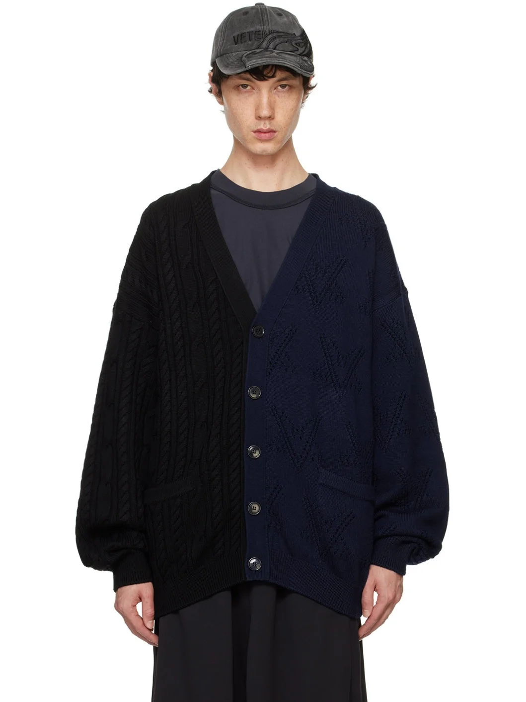 Cable knit and pointelle knit extrafine merino wool-blend cardigan. · Paneled construction · Rib knit Y-neck, hem, and cuffs · Button closure · Welt pockets · Dropped shoulders · Central exposed seam at back Supplier color: Black/Navy 99% extrafine merino wool, 1% polyamide. Made in Italy 242669M200002