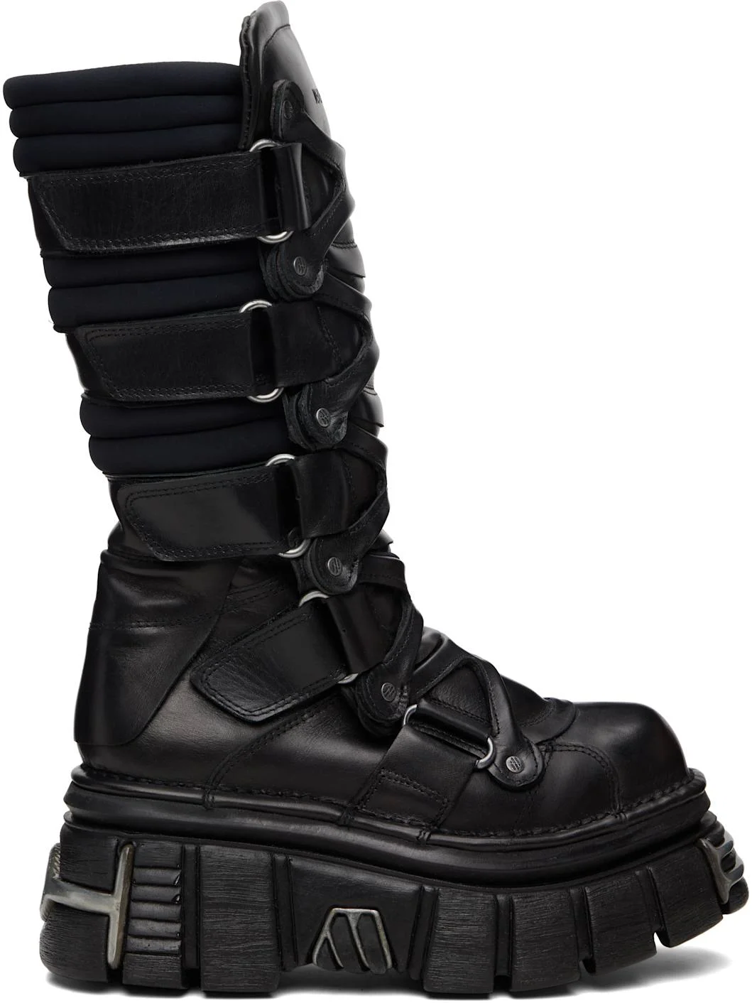 Knee-high buffed leather boots. · Logo-engraved hardware at toe and heel · Velcro closure · Logo embossed at padded tongue · Padded neoprene collar · Treaded rubber platform sole · Silver-tone hardware · Platform: H2.5" Part of the VETEMENTS x New Rock collaboration. Supplier color: Black Upper: leather, textile. Sole: rubber. Made in Spain 261669M228000