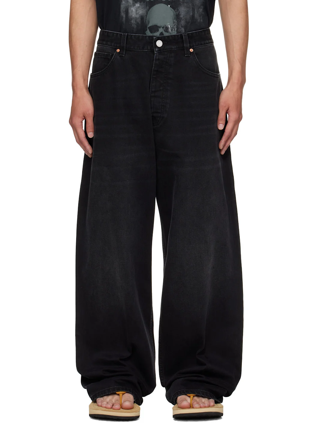 Non-stretch denim jeans. · Fading throughout · Belt loops · Four-pocket styling · Button fly · Logo patch at back waistband · Graphic printed and embroidered at back pocket Supplier color: Vintage black Body: 100% cotton. Trim: 65% polyester, 35% cotton. Made in Italy 252669M186003
