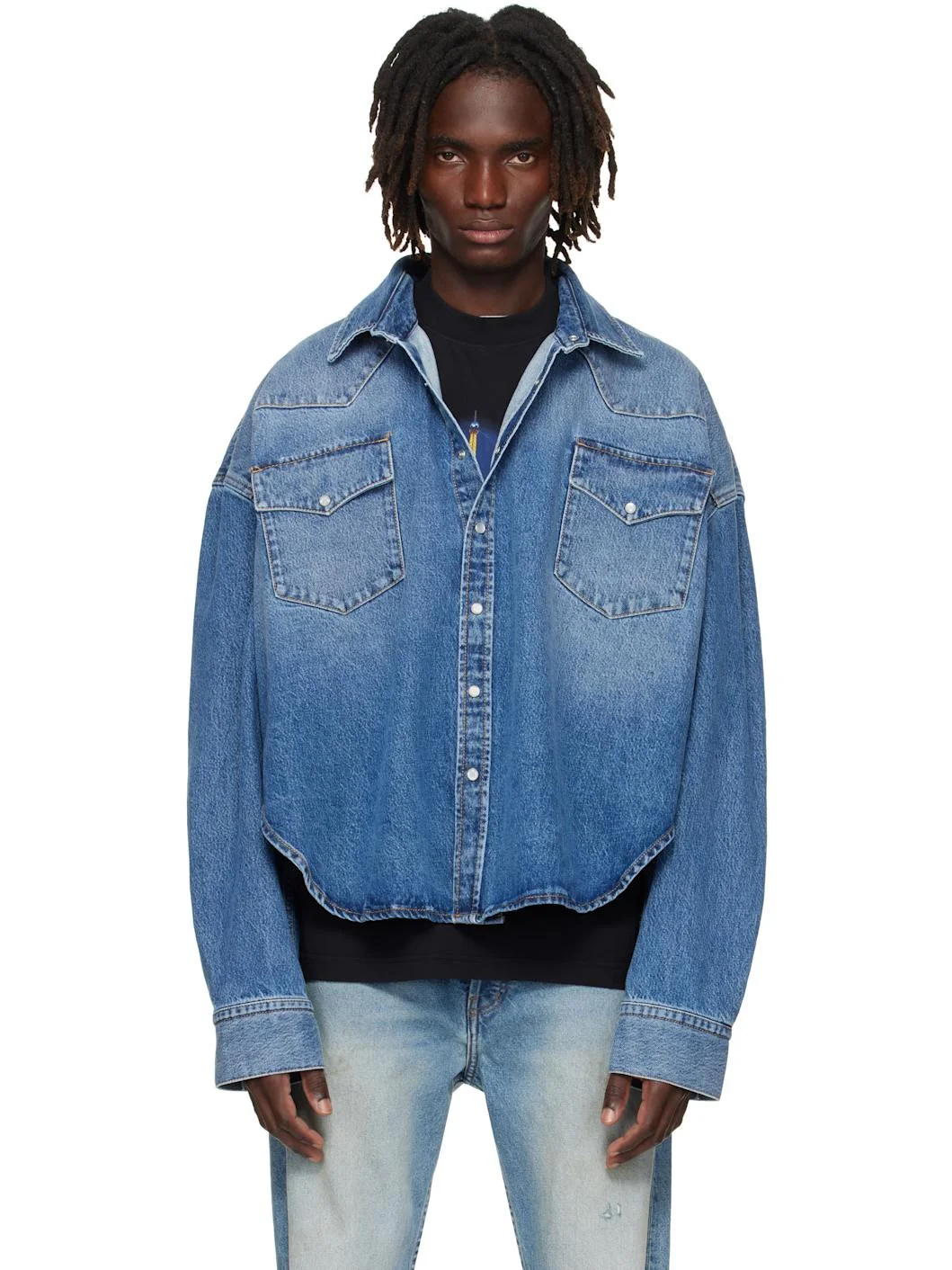 Non-stretch denim shirt. · Fading throughout · Spread collar · Press-stud closure · Western-style yoke · Flap pockets at chest · Cropped shirttail hem · Press-stud barrel cuffs · Contrast stitching in tan Supplier color: Mid blue Body: 100% cotton. Trim: 65% polyester, 35% cotton. Made in Italy 252669M192009