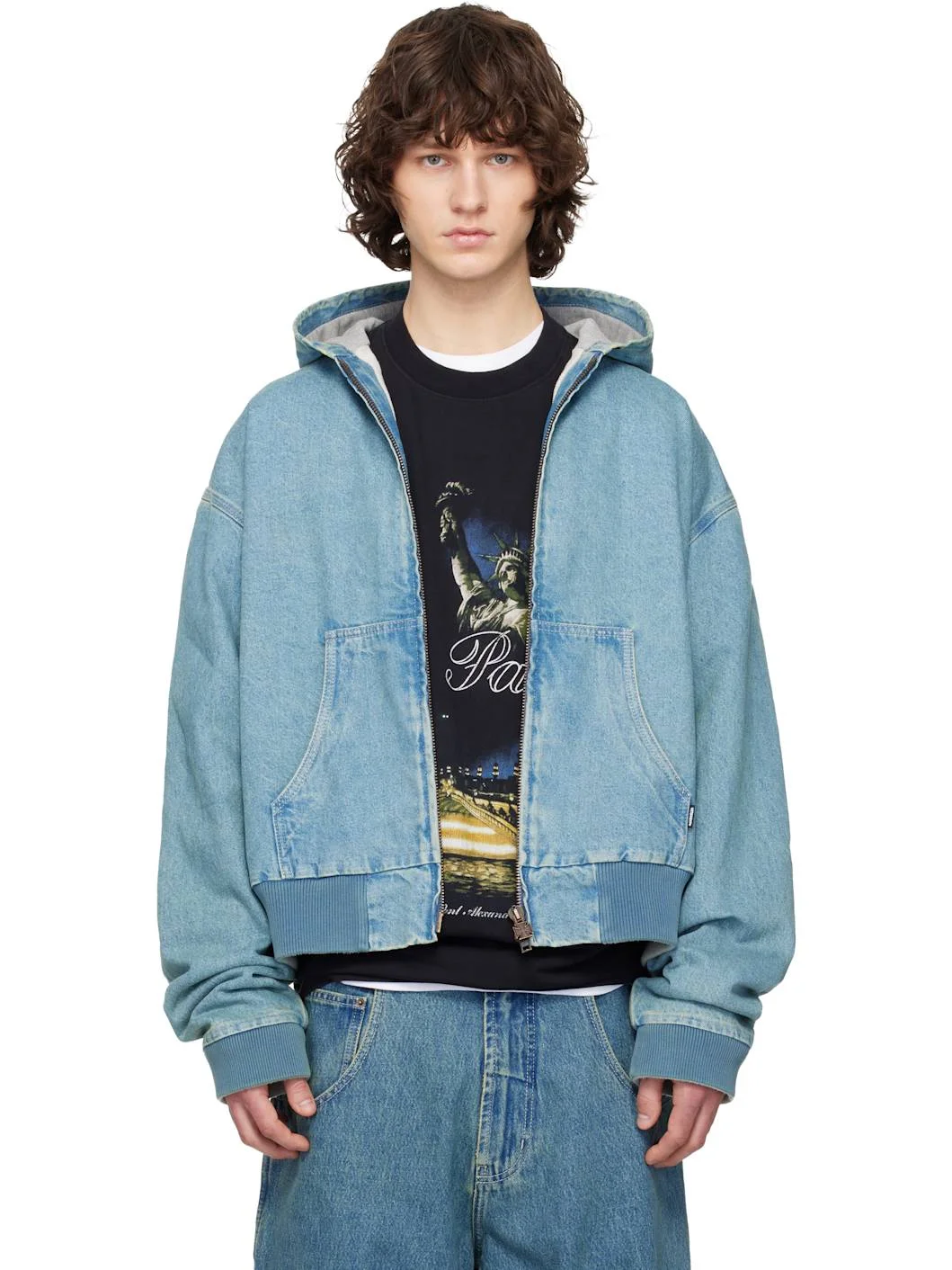Non-stretch denim jacket. · Fading throughout · Eyelets at hood · Two-way zip closure · Patch pockets at waist · Logo flag at pocket · Rib-knit hem and cuffs · Dropped shoulders · Loop at back collar · French terry and jersey lining Supplier color: Vintage Mid Blue Body: 100% cotton. Lining: 80% cotton, 20% polyester. Made in Italy 261669M177002