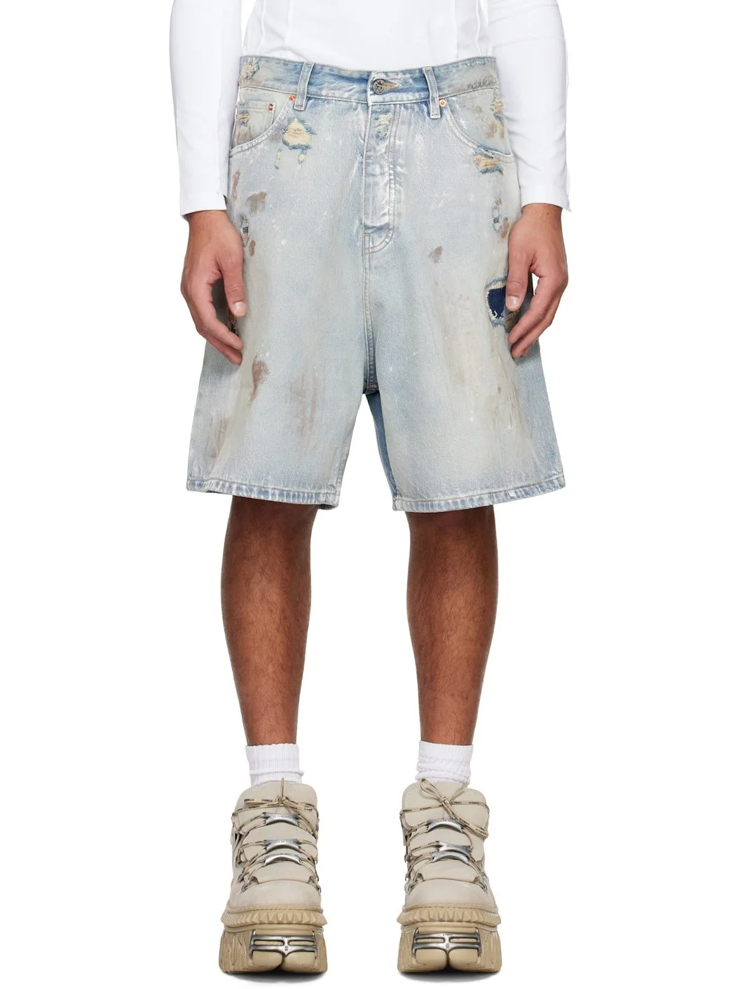 Non-stretch denim shorts. Fading and distressing throughout. · Belt loops · Five-pocket styling · Button-fly · Printed paint splatter at front and back · Logo patch at back waist · Logo-engraved silver-tone hardware · Contrast stitching in tan Supplier color: Light blue 100% cotton. Made in Italy 251669M193000