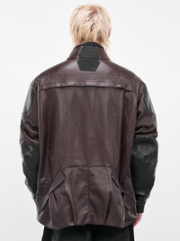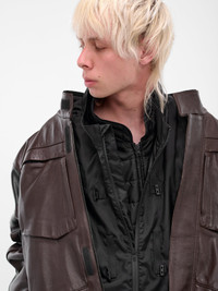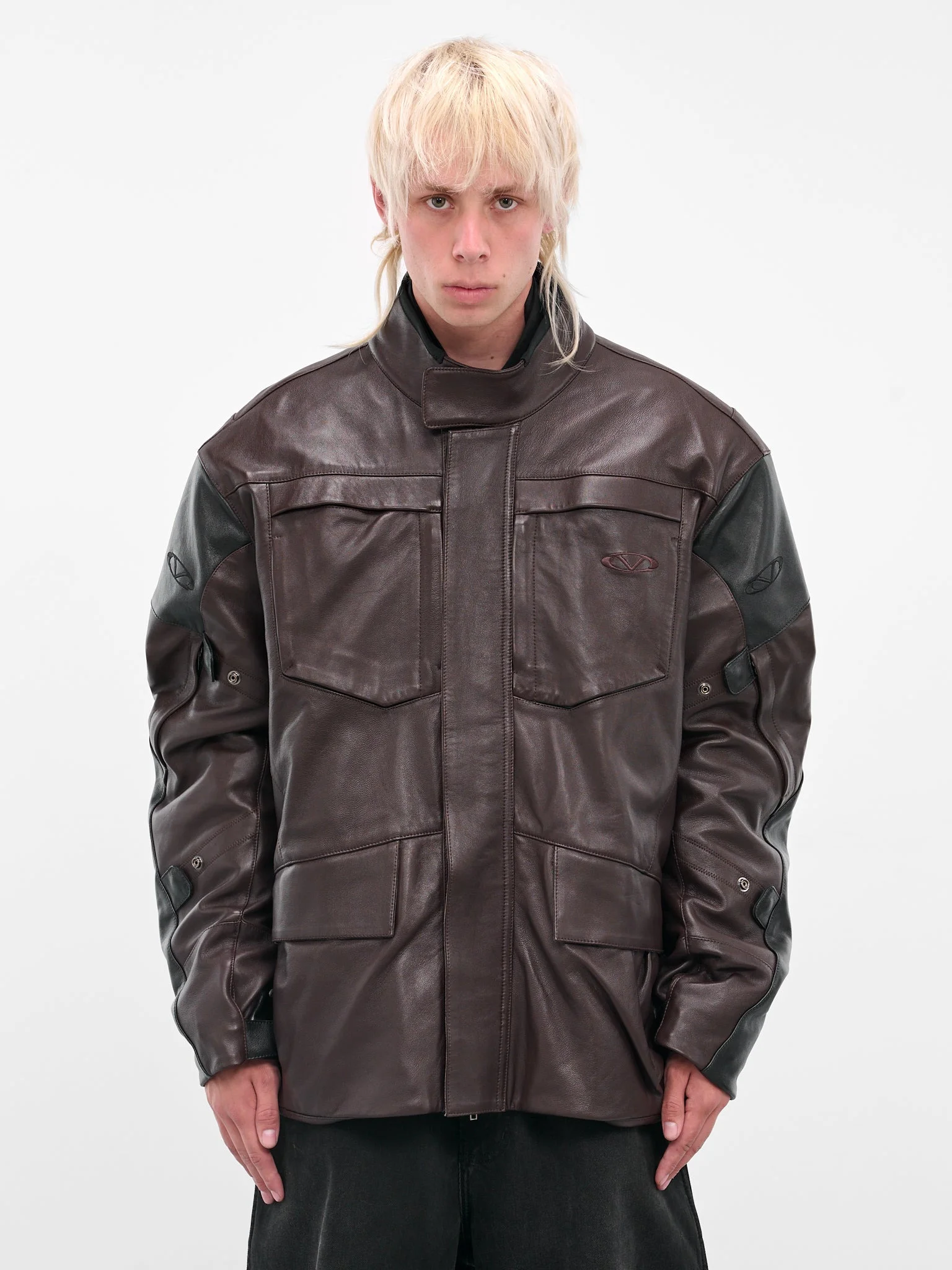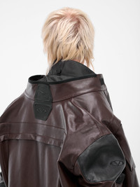 This brown leather biker parka jacket is detailed with embroidered logos, rubber patches, and moto-inspired paneling for a structured, oversized silhouette. Multiple zip closures and inner insulation layers offer versatile styling and functional depth. Featuring: • Oversized fit • Embroidered logos and rubber patches throughout • Moto jacket paneling and detailing • Stand collar with concealed placket closure • Long sleeves with press-studs • Front flap pockets • Inner insulation layers • Multiple zip closures for varied styling • Made in Italy • 100% Leather • Standard sizing Model is 6'0" wearing size S. Shoulders: 19" Chest: 38" Waist: 30
