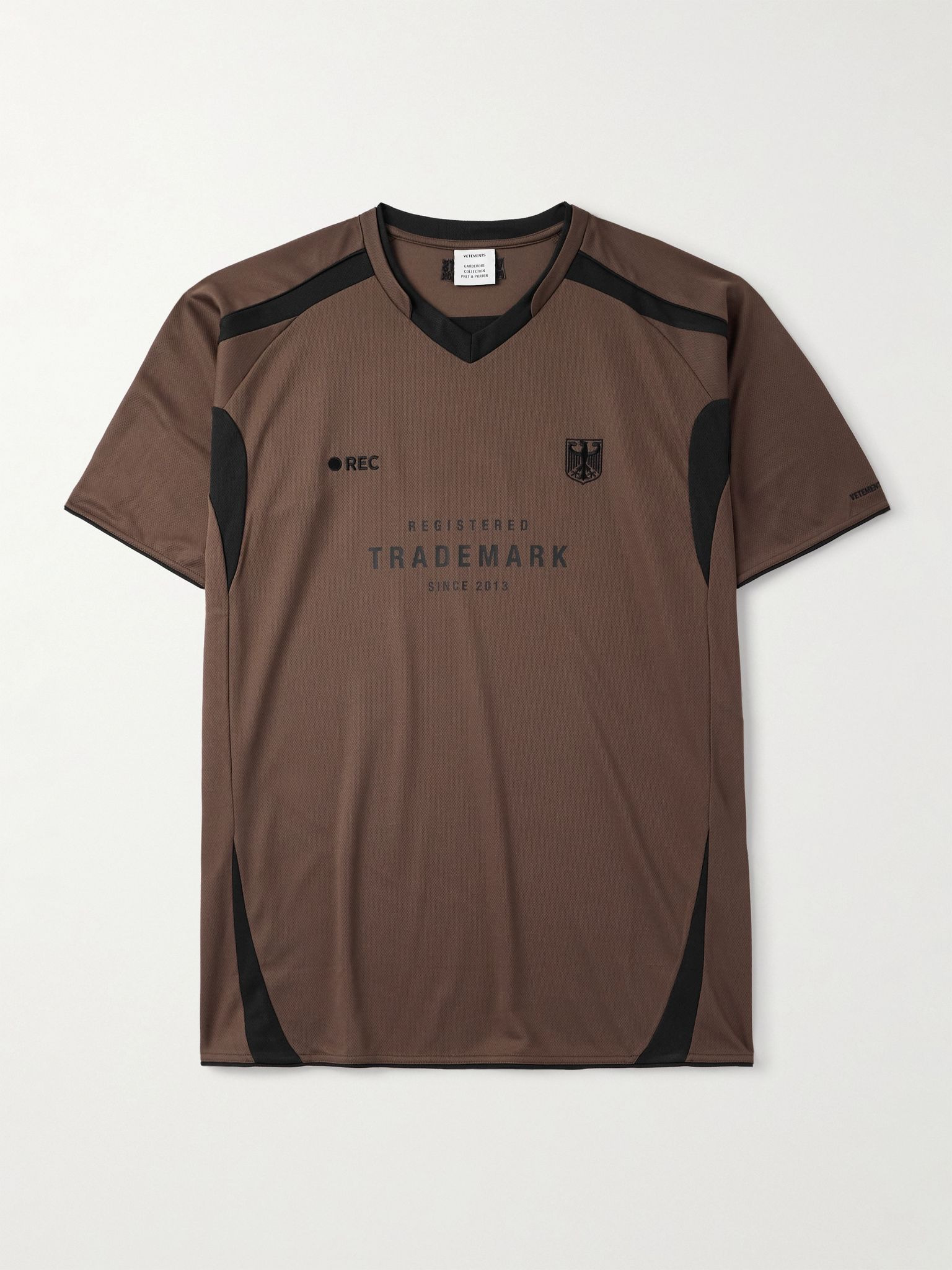 Vetements' T-shirt is based on official match kits. Like the jerseys worn by professional footballers, it's made from panelled cotton-mesh and has 'Registered Trademark' printed on the chest—a tongue-in-cheek reference to team sponsorships. Size & Fit - Model wears a size larger to achieve a looser fit - Mid-weight, slightly stretchy fabric - Model is shown wearing a M - Model measures: chest 36"/ 92cm, height 6'2"/ 188cm Details & Care - Dark-brown and black cotton-mesh - 100% cotton - Machine wash