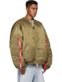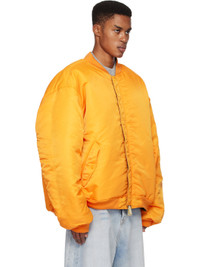 Reversible insulated nylon satin bomber jacket. Reverse in orange nylon satin. · Paneled construction · Rib-knit stand collar, hem, and cuffs · Two-way zip closure · Flap pockets · Dropped shoulders · Zip and utility pockets at sleeves · Logo flags at sleeves · Flap pockets at interior · Logo-engraved gold-tone hardware Part of the VETEMENTS x Alpha Industries collaboration. Supplier color: Green