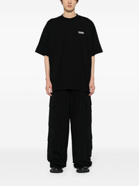 cargo cotton track pants Showcasing its unique and unconventional take on fashion, VETEMENTS presents a hybrid between athleticwear and utilitarian inspiration. These track pants are crafted from a black cotton blend and framed with multiple cargo pockets along the sides. Highlights - Black - Cotton blend - Jersey texture - Elasticated waistband - Multiple cargo pockets - Wide leg - When buying this unisex item, keep in mind that it is graded in standard men's sizing. Imported Composition Cotton 80%, Polyester 20% SIZE & FIT Model measurements Height 6 ft 2 in(1.87 m) Bust/Chest 34.25 in(87 cm) Hips 36.22 in(92 cm) Waist 29.52 in(75 cm) FittingInformation This piece is unisex and is designed with a wide-leg, whether you usually select women's or men's sizes Adjust this piece’s waistband to your preference using the drawstring Made from a midweight non-stretch fabric, this piece offers minimal elasticity when worn Washing instructions Machine Wash