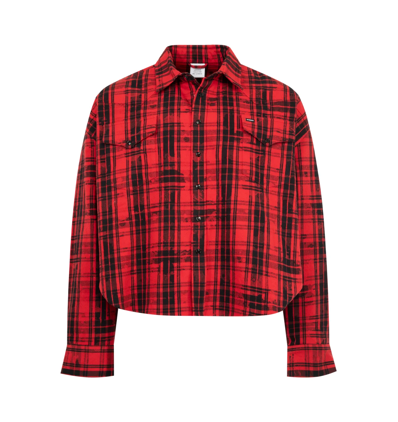 VETEMENTS Cowboy Flannel Shirt featuring spread collar, button closure, flap pockets at chest, shirttail hem and locker loop at back yoke. Made in Portugal. DESIGNER STYLE ID: ME76FS055RB COLOR: RED/BLACK CHECK