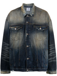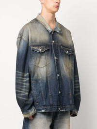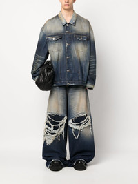 distressed-effect stonewashed denim jacket Highlights - Navy blue - Cotton - Denim - Acid wash - Stonewashed - Classic collar - Distressed effect - Front button fastening - Two chest patch pockets - Long sleeves - Buttoned-cuff sleeves - Straight hem Made in Italy Composition Cotton 100% SIZE & FIT Model measurements Height 6 ft 1 in(1.86 m) Bust/Chest 36.61 in(93 cm) Hips 37 in(94 cm) Waist 28.74 in(73 cm) FittingInformation Designed for an oversized fit, offering additional room throughout Sturdy and hard-wearing, this denim piece offers no stretch This piece fits true to size – take your usual size Washing instructions Machine Wash