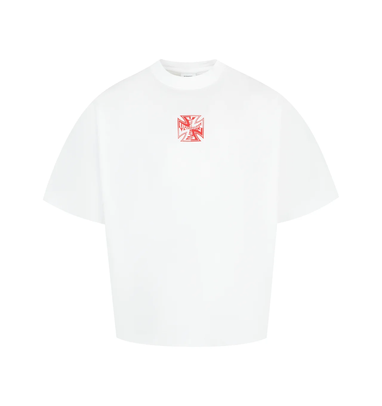 VETEMENTS Double Biker Cross Logo T-shirt featuring rib-knit crewneck, logo at front and back, dropped shoulders and short sleeves. 100% cotton. DESIGNER STYLE ID: ME76TR178W COLOR: WHITE