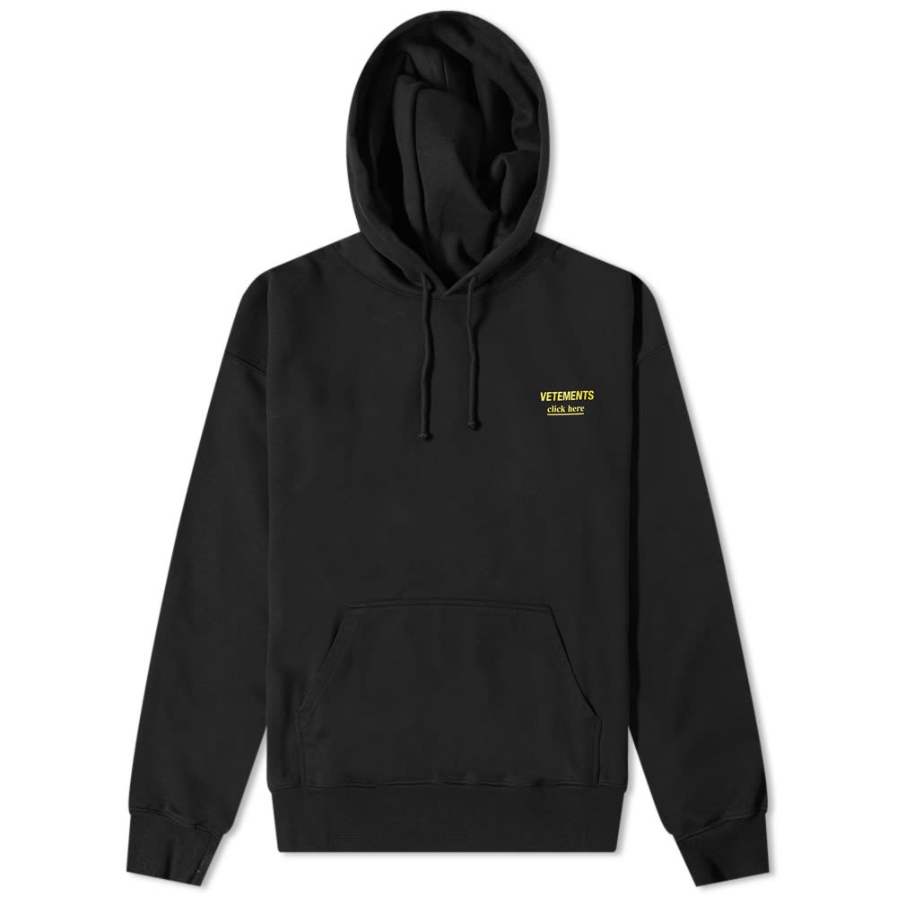 Continuing its love for extreme silhouettes, VETEMENTS offers up this super-relaxed, oversized black hoody. Perfect for laid-back days, it's crafted from a soft cotton-blend and fitted with a cosy drawstring hood and spacious pouch pocket. It’s then signed off at the chest with vibrant yellow ‘click here’ graphic branding for a colourful hint of brand appeal. - 80% Cotton, 20% Polyester - Drawstring Hood - Pouch Pocket - Ribbed Trims - Printed Branding - Made in Portugal