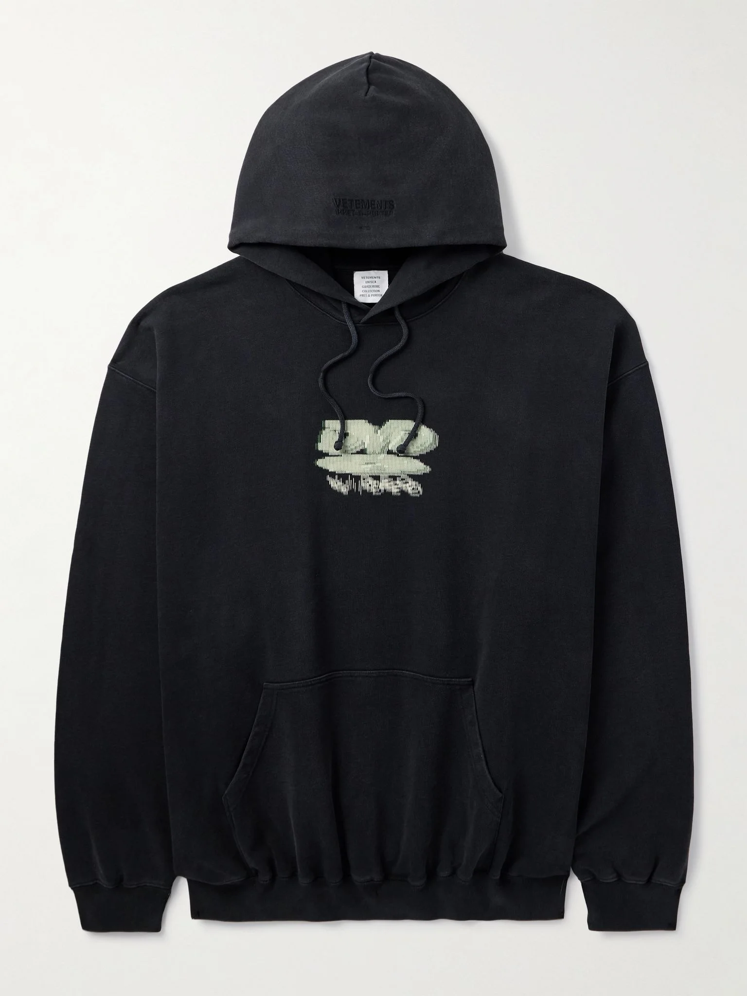 Vetements' hoodie is printed with a nostalgic, blurred 'DVD' motif at the chest. It's cut for an oversized fit from cotton-jersey and subtly embroidered with a logo along the hood. Size & Fit - Intended to be oversized; we recommend sizing down if you prefer a closer fit - Mid-weight, slightly stretchy fabric - Model is shown wearing a S - Model measures: chest 36"/ 92cm, height 6'0"/ 183cm Details & Care - Black, light-green and beige cotton-jersey - 100% cotton - Machine wash