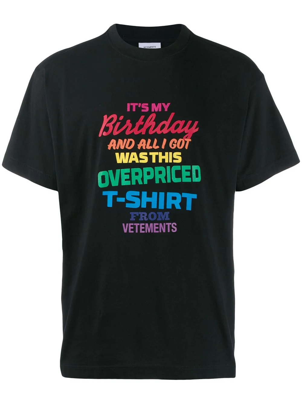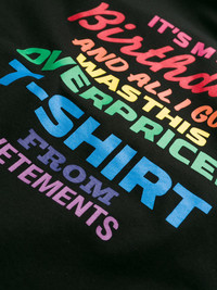 rainbow slogan T-shirt Black cotton rainbow slogan T-shirt from Vetements featuring a round neck, short sleeves and a straight fit. Imported Composition Cotton 100% SIZE & FIT Model measurements Height 6 ft 2 in(1.87 m) Bust/Chest 36.41 in(92.5 cm) Hips 37 in(94 cm) Waist 29.52 in(75 cm) FittingInformation This piece fits true to size. We recommend you get your regular size Cut for a relaxed fit Washing instructions Machine Wash