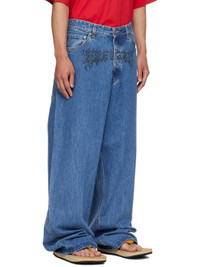 Non-stretch denim jeans. · Fading throughout · Belt loops · Five-pocket styling · Button fly · Text printed at front · Logo patch at back waistband · Contrast stitching in tan Part of the Cradle of Filth capsule. Supplier color: Light blue Body: 100% cotton. Trim: 65% polyester, 35% cotton. Made in Italy 252669M186002