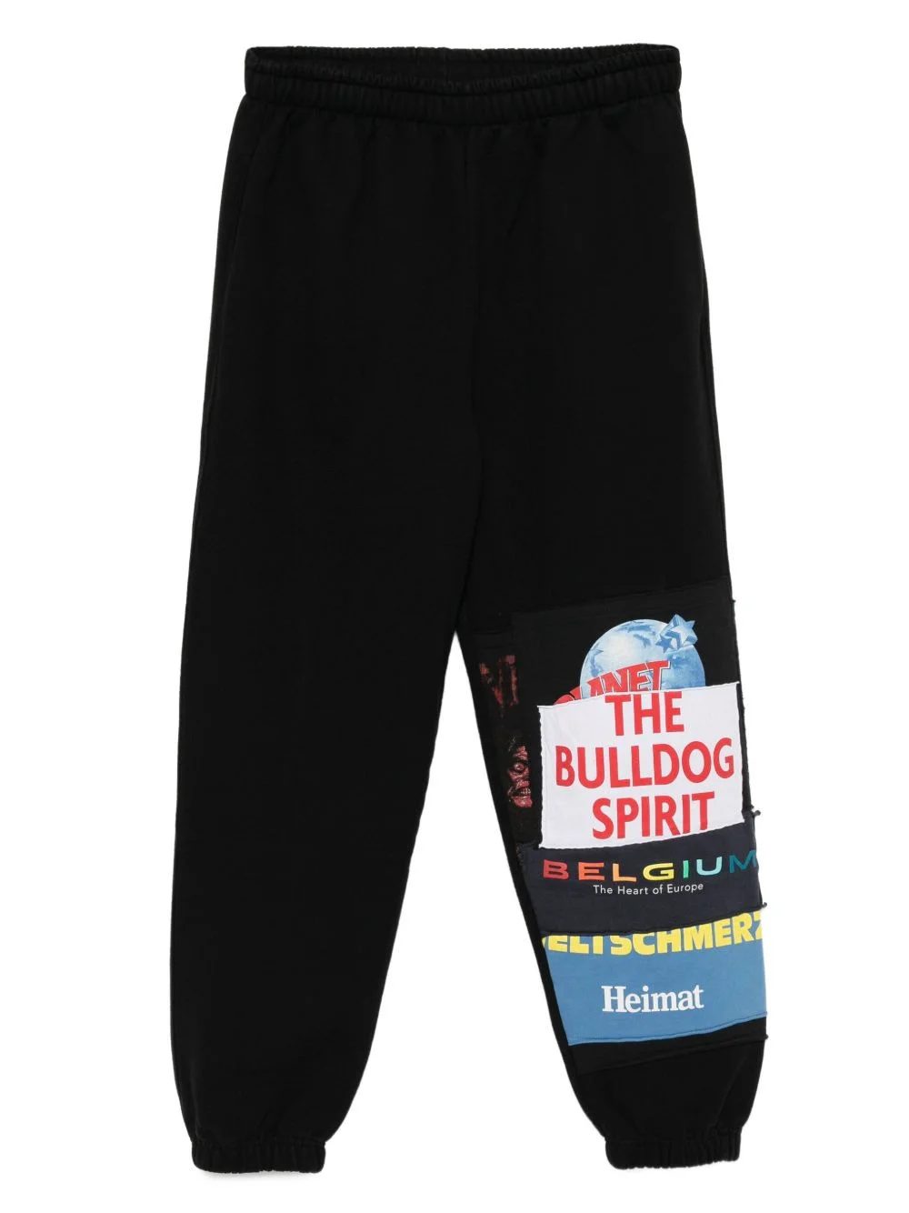 graphic-print trousers Highlights - Black - Elasticated waistband - Two side slit pockets - Logo patch to the rear Imported Composition Cotton 85%, Polyester 15% SIZE & FIT Model measurements Height 6 ft 2 in(1.87 m) Bust/Chest 33.07 in(84 cm) Hips 35.43 in(90 cm) Waist 26.77 in(68 cm) FittingInformation Designed for a relaxed tapered leg, allowing a comfortable loose fit above the knee with a closer fit towards the calves Adjust this piece’s waistband to your preference using the drawstring Made from a heavyweight non-stretch fabric, this piece offers minimal elasticity when worn Washing instructions Machine Wash