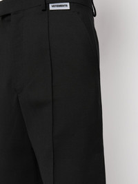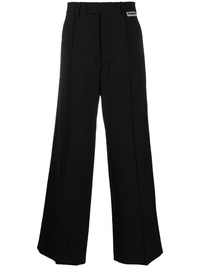 wide-leg tailored trousers jet black virgin wool blend logo patch to the side concealed front button fastening concealed front zip fastening belt loops two diagonal pockets to the sides two rear welt pockets Imported Composition Outer: Virgin Wool 93%, Elastane 4%, Polyamide 3% Lining: Viscose 100% SIZE & FIT Model measurements Height 6 ft 2 in(1.87 m) Bust/Chest 38.18 in(97 cm) Hips 36.61 in(93 cm) Waist 29.13 in(74 cm) FittingInformation This piece fits true to size. We recommend you get your regular size Designed for a slim fit at the waist and loose over the leg Made with a mid-weight stretch fabric Washing instructions Dry Clean Only