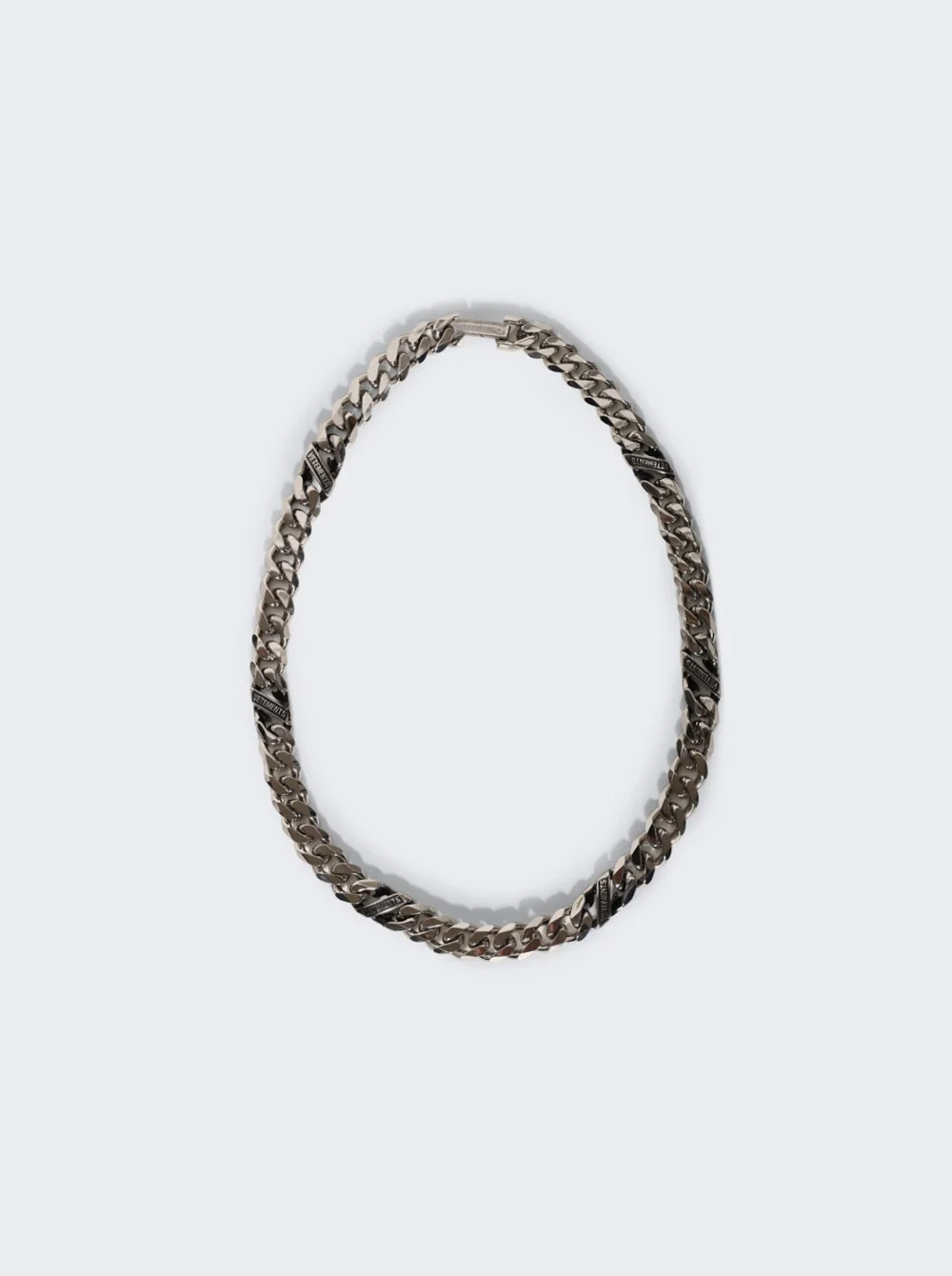 Details - Cuban link - Logo engraved at length - Flip-clasp fastening - Antiqued silver-tone brass - Care: To keep the luster of your piece avoid contact with perfumes or lotions. Remove before showering, swimming, or exercise. After each use wipe your piece with a jewelry cloth or cotton ball. - Material: 100% Brass Vendor Color Code: Brand Style: UH76NE850S Designer/Brand: VETEMENTS