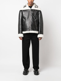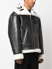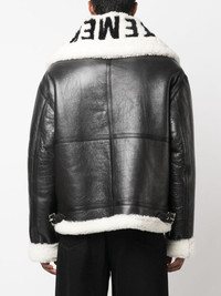 logo-collar lambskin jacket Boasting a supple lambskin construction, this jacket from VETEMENTS is crafted in Italy. Its zipped silhouette is elevated with a shearling collar, printed with the brand's name for an iconic finish. Highlights - Black - Lambskin - Shearling collar - Logo lettering - Two front welt pockets - Front zip fastening - Long sleeves - When buying this unisex item, keep in mind that it is graded in standard men's sizing. Made in Italy Composition Lamb Skin 100% SIZE & FIT Model measurements Height 5 ft 11 in(1.8 m) Bust/Chest 33.07 in(84 cm) Hips 37.4 in(95 cm) Waist 25.19 in(64 cm) FittingInformation This piece is unisex – if you usually select men's sizing expect a loose fit throughout; if you usually select women's sizes, expect an oversized fit Soft leather has a supple and smooth construction offering some flexibility