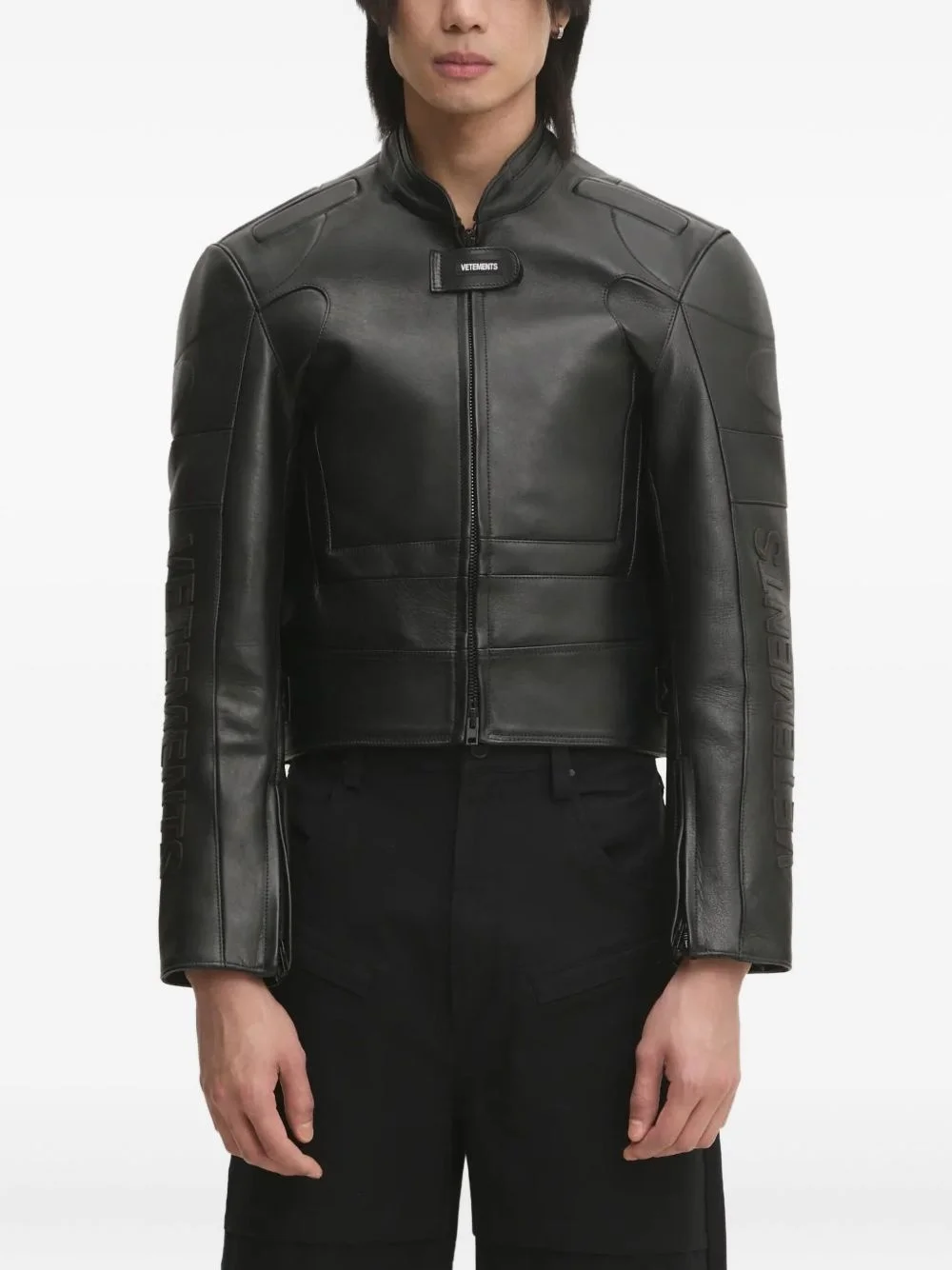 logo-embossed leather jacket Highlights - Black - Leather - Embossed logo detail - Zip fastening - Stand-up collar Made in Italy Composition Outer: Calf Leather 100% Lining: Polyester 100%, Viscose 100%, Polyamide 83%, Elastane 17% Washing instructions Specialist Cleaning