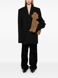 logo-embroidered blazer Highlights - Black - Virgin wool blend - Embroidered logo to the rear - Front button fastening - Wide notch lapels - Shoulder pads - Long sleeves - Buttoned cuffs - Chest welt pocket - Dart detailing - Two front flap pockets - American rear vent - Internal jetted pocket - Logo-jacquard lining - Curved hem - When buying this unisex item, keep in mind that it is graded in standard men's sizing. Made in Italy Composition Outer: Virgin Wool 93%, Elastane 4%, Polyamide 3% Lining: Viscose 100% SIZE & FIT Model measurements Height 5 ft 9 in(1.75 m) Bust/Chest 31.88 in(81 cm) Hips 34.64 in(88 cm) Waist 24.01 in(61 cm) FittingInformation This unisex piece is designed for an oversized fit whether you usually select women's or men's sizes The internal shoulder pads offer a structured shape Made from a midweight fabric