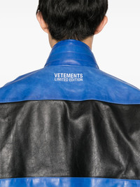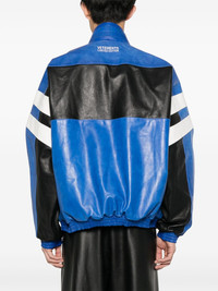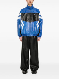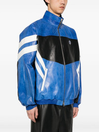 logo-embroidered leather jacket Highlights - Black/blue - Calf leather - Panelled design - Stripe detailing - Decorative stitching - High neck - Long sleeves - Elasticated cuffs - Embroidered logo at the chest - Two side zip-fastening pockets - Mesh lining - Front two-way zip fastening - When buying this unisex item, keep in mind that it is graded in standard men's sizing. Made in Italy Composition Calf Leather 100% SIZE & FIT Model measurements Height 5 ft 8 in(1.73 m) Bust/Chest 29.92 in(76 cm) Hips 33.07 in(84 cm) Waist 23.22 in(59 cm) FittingInformation This unisex piece is designed for an oversized fit whether you usually select women's or men's sizes The elasticated hem allows for movement and a comfortable fit Firm leather offering little flexibility to maintain its durability and sturdiness