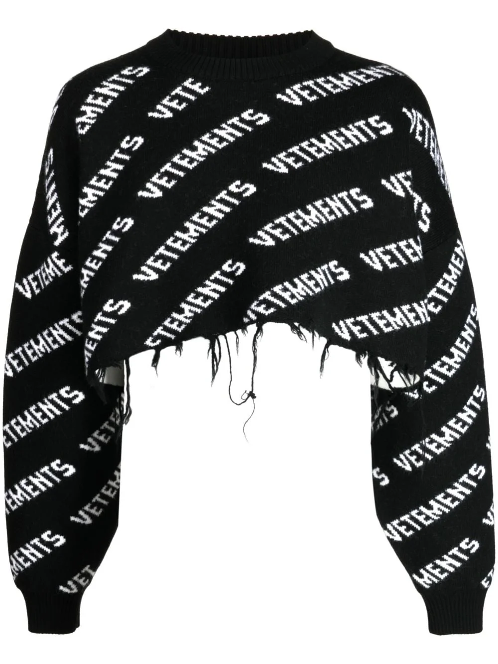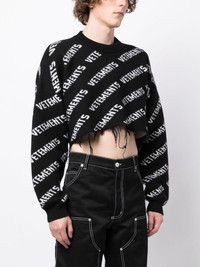 logo intarsia-knit distressed jumper Highlights - Black/white - Merino wool - Patterned intarsia-knit logo - Distressed effect - Crew neck - Drop shoulder - Long sleeves - Ribbed cuffs - Raw-cut hem - Cropped Made in Italy Composition Body: Merino 100% SIZE & FIT Model measurements Height 6 ft 2 in(1.87 m) Bust/Chest 36.22 in(92 cm) Hips 37.79 in(96 cm) Waist 28.34 in(72 cm) FittingInformation Designed to be unstructured, offering a loose fit throughout Constructed with additional length on the sleeve Made with a heavyweight knit, this piece offers some stretch This piece fits true to size – take your usual size Washing instructions Dry Clean Only
