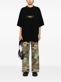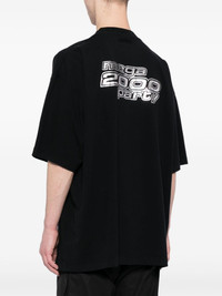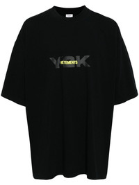 logo-print cotton T-shirt Vetements' clothes often incorporate elements of streetwear and popular culture. As seen in this black T-shirt, which boats a relaxed design enhanced with a contrasting slogan-print at the rear in a silver-tone. Highlights - Black - Cotton - Logo print at the chest - Slogan print to the rear - Round neck - Drop shoulder - Short sleeves - Straight hem - When buying this unisex item, keep in mind that it is graded in standard men's sizing. Imported Composition Body: Cotton 100% SIZE & FIT Model measurements Height 5 ft 10 in(1.77 m) Bust/Chest 31.49 in(80 cm) Hips 35.43 in(90 cm) Waist 25.19 in(64 cm) FittingInformation This unisex piece is designed for an oversized fit whether you usually select women's or men's sizes Made from a midweight non-stretch fabric, this piece offers minimal elasticity when worn Washing instructions Machine Wash