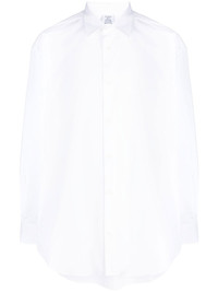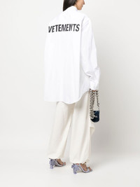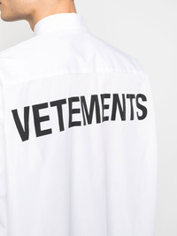 logo-print long-sleeves shirt Vetements gives a branded twist to this timeless white shirt, boasting an oversized printed logo on the back in a contrasting black hue. Highlights - White - Cotton - Logo print to the rear - Classic collar - Front button fastening - Long sleeves - Buttoned cuffs - Drop shoulder - Curved hem - When buying this unisex item, keep in mind that it is graded in standard men's sizing. Made in Italy Composition Cotton 100% SIZE & FIT Model measurements Height 5 ft 11 in(1.8 m) Bust/Chest 33.07 in(84 cm) Hips 37.4 in(95 cm) Waist 25.19 in(64 cm) FittingInformation This piece is unisex. Please take care when selecting your size Cut for an oversized fit for both men and women Made with a mid-weight non-stretch fabric