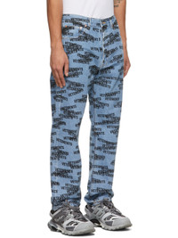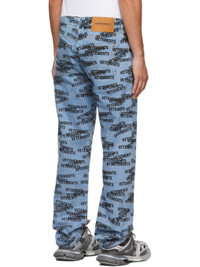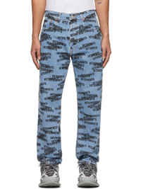 Straight-leg non-stretch denim jeans in blue featuring fading and logo pattern printed in black throughout. · Mid-rise · Five-pocket styling · Belt loops at waistband · Leather logo patch in tan at back waistband · Button-fly · Logo-engraved copper-tone and silver-tone hardware · Contrast stitching in black Supplier color: Zebra print 100% cotton.