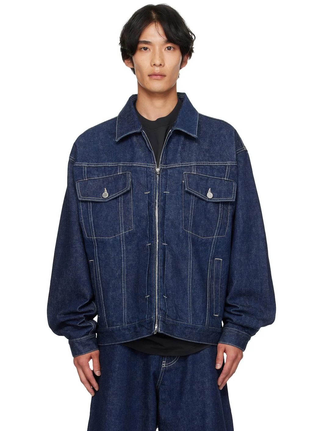 Non-stretch denim jacket. · Spread collar · Two-way zip closure · Flap and welt pockets at front · Adjustable buttoned barrel cuffs · Logo-woven locker loop at back yoke · Adjustable button tabs at back hem · Contrast stitching in white Supplier color: Blue Body: 100% cotton. Trim: 65% polyester, 35% cotton. Made in Italy 252669M177000
