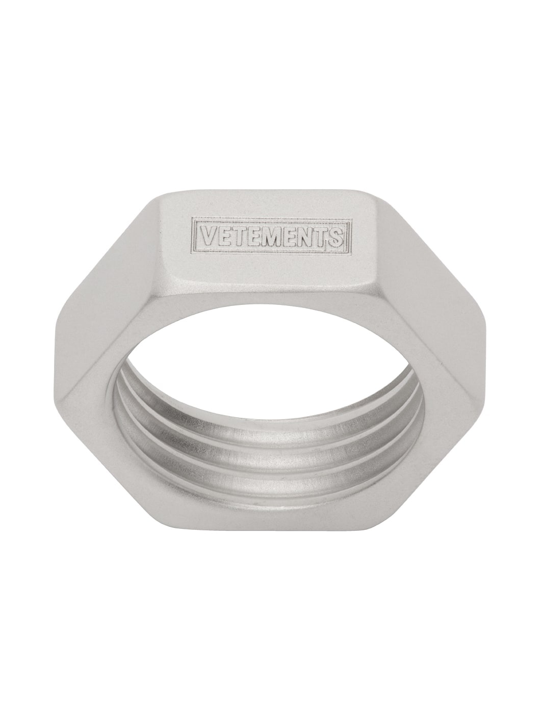 Graphic band ring in silver-tone brass. Logo engraved at face. Supplier color: Silver
