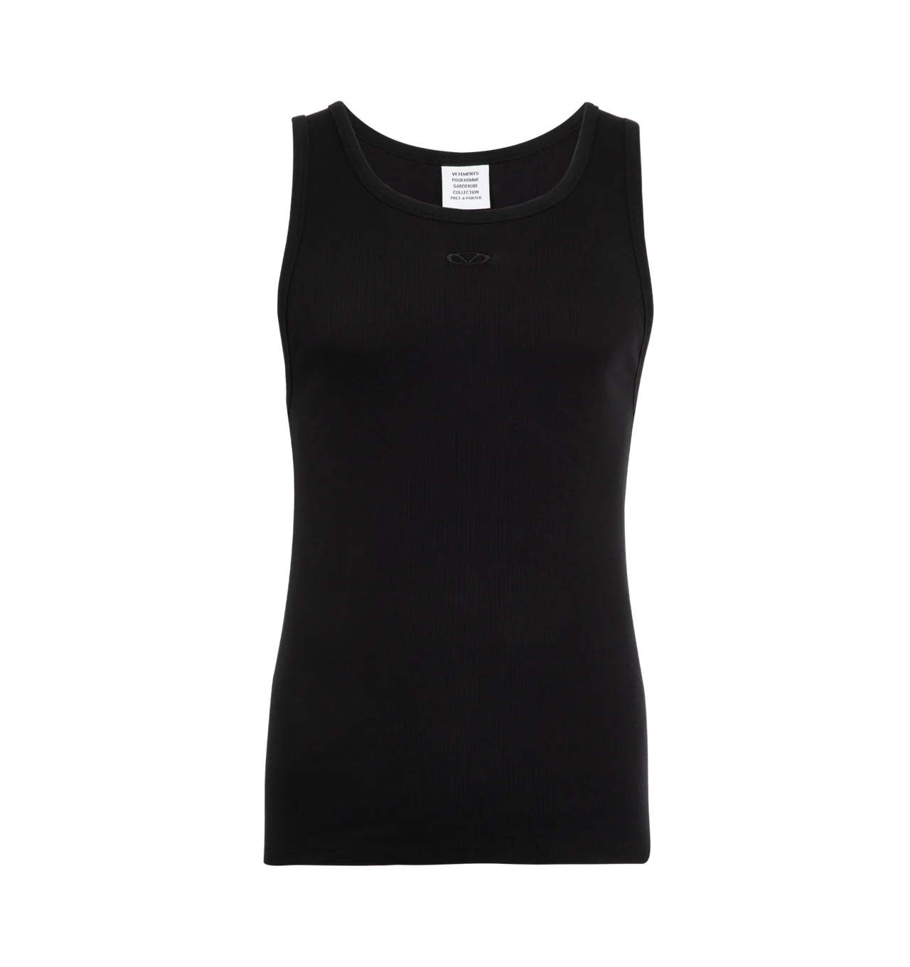 VETEMENTS Oval Logo Tank Top featuring stretch cotton jersey tank top, rib-knit crewneck and armscyes, logo graphic printed at chest, logo embroidered at back collar and racer back. 90% cotton, 10% elastane. Made in Portugal. DESIGNER STYLE ID: MH76TT120B COLOR: BLACK