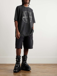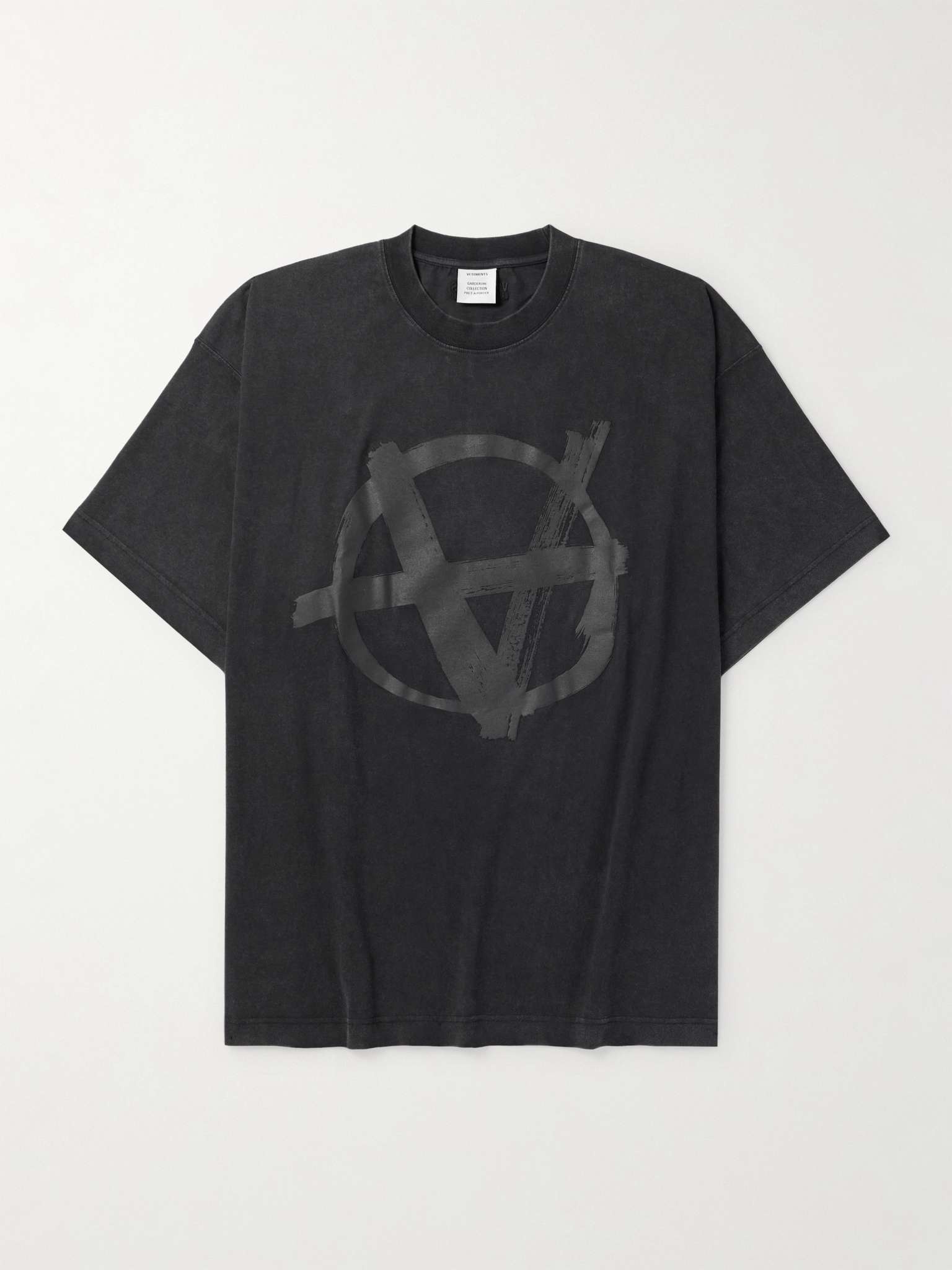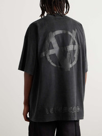 Vetements' creative spectrum ranges from cheeky to irreverent. Falling on the latter end, this T-shirt is cut for an oversized fit from stretch-cotton jersey and printed with an inverted anarchy symbol. Size & Fit - Fits true to size. Take your normal size - Designed for an oversized fit - Lightweight, stretchy fabric - Model is shown wearing a M - Model measures: chest 38"/ 96cm, height 6'0"/ 183cm Details & Care - Black and charcoal stretch-cotton jersey - 97% cotton, 3% elastane - Machine wash
