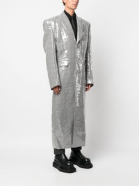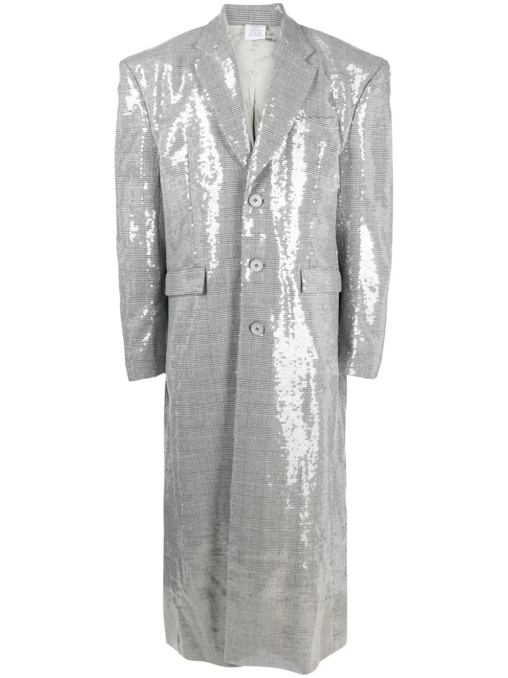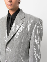sequin-embellished checked coat Highlights - Light grey - Sequin embellishment - Check pattern - Shoulder pads - Notched lapels - Front button fastening - Long sleeves - Buttoned cuffs - Two side flap pockets - Straight hem - When buying this unisex item, keep in mind that it is graded in standard men's sizing. Made in Italy Composition Outer: Rayon 68%, Polyester 30%, Sapphire 2% Lining: Viscose 100% SIZE & FIT Model measurements Height 6 ft 1 in(1.85 m) Bust/Chest 35.43 in(90 cm) Hips 35.82 in(91 cm) Waist 27.55 in(70 cm) FittingInformation This unisex piece is designed for an oversized fit whether you usually select women's or men's sizes The internal shoulder pads offer a structured shape Made from a midweight non-stretch fabric