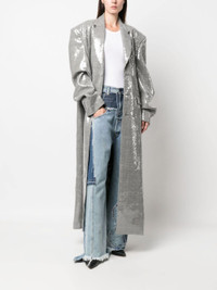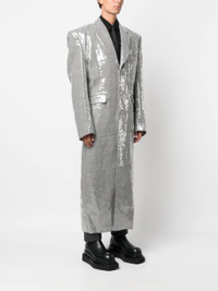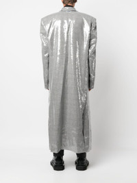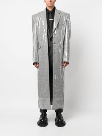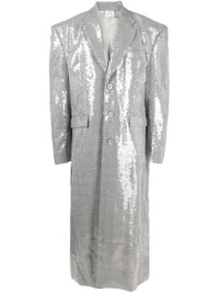 sequin-embellished checked coat from VETEMENTS (VIP) featuring light grey, sequin embellishment, check pattern, shoulder pads, notched lapels, front button fastening, long sleeves, buttoned cuffs, two side flap pockets and straight hem. When buying this unisex item, keep in mind that it is graded in standard men's sizing.. Size & Fit Model Measurements: Height: 1.85 m Bust/Chest: 91.0 cm Hips: 93.0 cm Waist: 73.0 cm Model wears size S Fabric and Care Designer Style ID: UE63CO800G Designer Colour: SEQUINS CHECK/GREY CHECK Composition: Outer: Rayon 68%, Sapphire 2%, Polyester 30%; Lining: Viscose 100% Washing instructions: Hand Wash Made in Italy