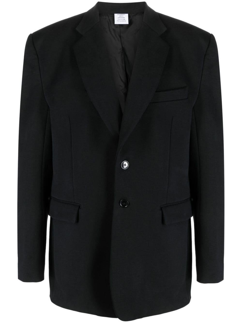 single-breasted tailored blazer Vetements updates the classic blazer by bringing its signature oversized silhouette into the garment. It's crafted from a black cotton blend and features dropped shoulders, showcasing the brand's unique design. Highlights - Black - Cotton blend - Notched lapels - Front button fastening - Drop shoulder - Long sleeves - Buttoned cuffs - Chest welt pocket - Two front flap pockets - English rear vents Made in Italy Composition Outer: Cotton 80%, Polyester 20% Lining: Viscose 100% SIZE & FIT Model measurements Height 6 ft 1 in(1.86 m) Bust/Chest 35.4 in(90 cm) Hips 34.6 in(88 cm) Waist 30.7 in(78 cm) FittingInformation Designed for an oversized fit, offering additional room throughout The vented hem offers movement at the rear Made from a midweight non-stretch fabric This piece fits true to size – take your usual size