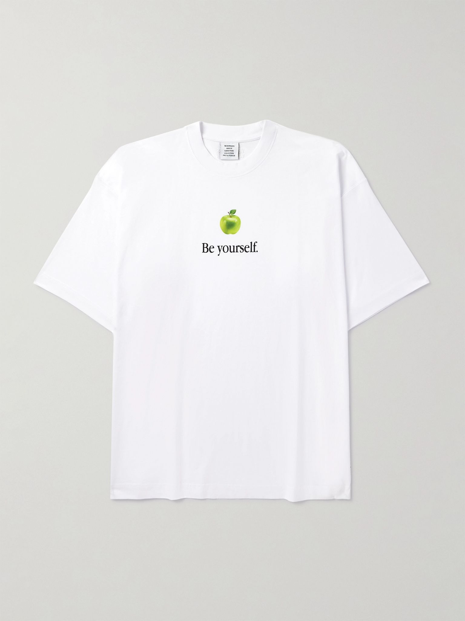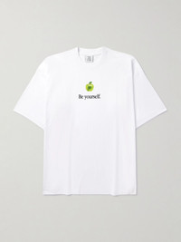 Vetements' T-shirt is printed with a simple reminder to 'Be Yourself'. It's cut from thick cotton-jersey for an oversized fit and decorated with a lifelike apple graphic, too. Size & Fit - Intended to be oversized; we recommend sizing down if you prefer a closer fit - Lightweight, slightly stretchy fabric - Model is shown wearing a S - Model measures: chest 36"/ 92cm, height 6'1"/ 185cm Details & Care - Multicoloured cotton-jersey - 100% cotton - Machine wash