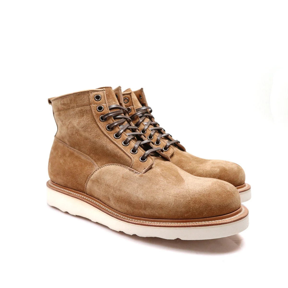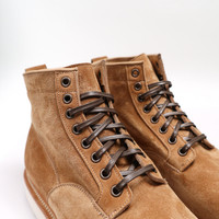 All our Viberg Boots are on a single E width, we suggest sizing down one full size from your standard sneaker size. Consider a half size down if you have wide feet. The Scout Boot references Viberg's #45 Hunter Boot, which dates back to the 1950's as an industrial work boot. The Scout, a new, shortened Hunter for the urban environment, was built for the Japanese market in 2010, featuring a pull loop, backstay, and essential soft sole. This Scout makeup is crafted from Opera's velvety soft Papillion calf suede, which has an extremely soft hand, and a lighter weight that should leave it with very little break-in required, without becoming floppy or too thin. The soft, easy-wearing nature of this suede pairs perfectly with its light golden brown tones, which themselves contrast nicely against the bone white Vibram Moreflex sole. All of this makes for a premium casual all-rounder, with plenty of comfort, lots of style, and no work required. - Opera Papillion Calf Suede - 2030 last - Plain toe - Amber vegtan lining - 8 AA caramel eyelets - Leather toe puff structure - Heel stiffener - White Vibram Moreflex outsole - 360 natural stormwelt - Resoleable channeled insole goodyear welt construction - Small batch, limited run production made at Viberg's factory in Victoria, BC