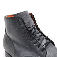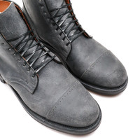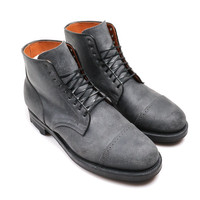 All our Viberg Service Boots are on a single E width, we suggest sizing down one full size from your standard sneaker size or brannock measurement. Consider sizing down a half size if you have a wide foot. Viberg's Service Boot is directly based on their original model, first produced in 1931. A similar pattern was also used by multiple nations as a standard issue military boot during WWII, however Viberg's quintessential Service Boot is modeled after the Canadian military's WWII Service Boot pattern. C.F. Stead's Waxy Commander offers an elite combination of patina-potential and weather resistance, thanks to a suede upper that has been heavily waxed for waterproofing - with the added benefit of improving the depth of texture in the suede. Waxy Commander uses Stead's proprietary tannage, which shrinks and increases the density of the fibers, serving to waterproof the uppers in combination with the wax, while also keeping the leather looking natural after the heavy waxing. With such a rich history, Stead have long developed rich, unique leather dyes that, in cooperation with the wax, produce incredible colours that are sure to patina outstandingly well. - C.F. Stead Waxy Commander - 2030 Last - Tan Kip Full Lining - Brogue Toe Cap - Structured Toe - Leather Toe Puff - Heel Stiffener - 9 Blind Eyelets - French Binding - Black Leather Midsole - Black Ridgeway Outsole - Resoleable Stitchdown Construction - Small batch, limited run production made at Viberg's factory in Victoria, BC