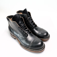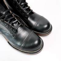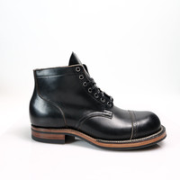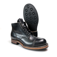 All our Viberg Service Boots are on a single E width, we suggest sizing down one full size from your standard sneaker size or brannock measurement. Viberg's Service Boot is directly based on their original model, first produced in 1931. A similar pattern was also used by multiple nations as a standard issue military boot during WWII, however Viberg's quintessential Service Boot is modeled after the Canadian military's WWII Service Boot pattern. This is a variation of a custom Viberg Service Boot we ran for our 35th Anniversary, crafted with Horween's Black Teacore Chromexcel, which offers a heavier weight and greater patina potential than most of Horween's Black CXL. Since this is a teacore hide it is still brown on the backside, and that brown interior will show through more and more as these boots see wear. These Black Teacore CXL Service Boots are constructed atop Viberg's 2040 last, so it offers significantly more volume than the 35th Anniversary boots. Chromexcel is a hot-stuffed combination tanned leather that goes through a lengthy tanning process at Horween's facility in Chicago, where it spends a month traveling from floor to floor, becoming heavily impregnated wiith grease and wax in the process. The end product is a soft, supple, and flexible hide which is packed full of oils, which gives Chromexcel the excellent pullup that it is known for - when the leather is flexed or bent, the oils are displaced and beautiful tonal highs and lows become visible. CXL only gets better with age, and taking care of the leather is as simple as it gets. Frequent brushing will blend scuffs and bring wicked patina, while the inherent oils in the hide keep it from drying out quickly. - Horween Black Teacore Chromexcel (CXL) - 2040 last - Unlined upper - Veg tan vamp lining - Gusseted Black CXL tongue - Leather toe puff toe structure - Brogue toe cap - 7 AA Gunmetal eyelets - Brown leather midsole - Black Dainite outsoles and heels - Traditional Resolable Stitch Down Construction - Small batch, limited run production made at Viberg's factory in Victoria, BC