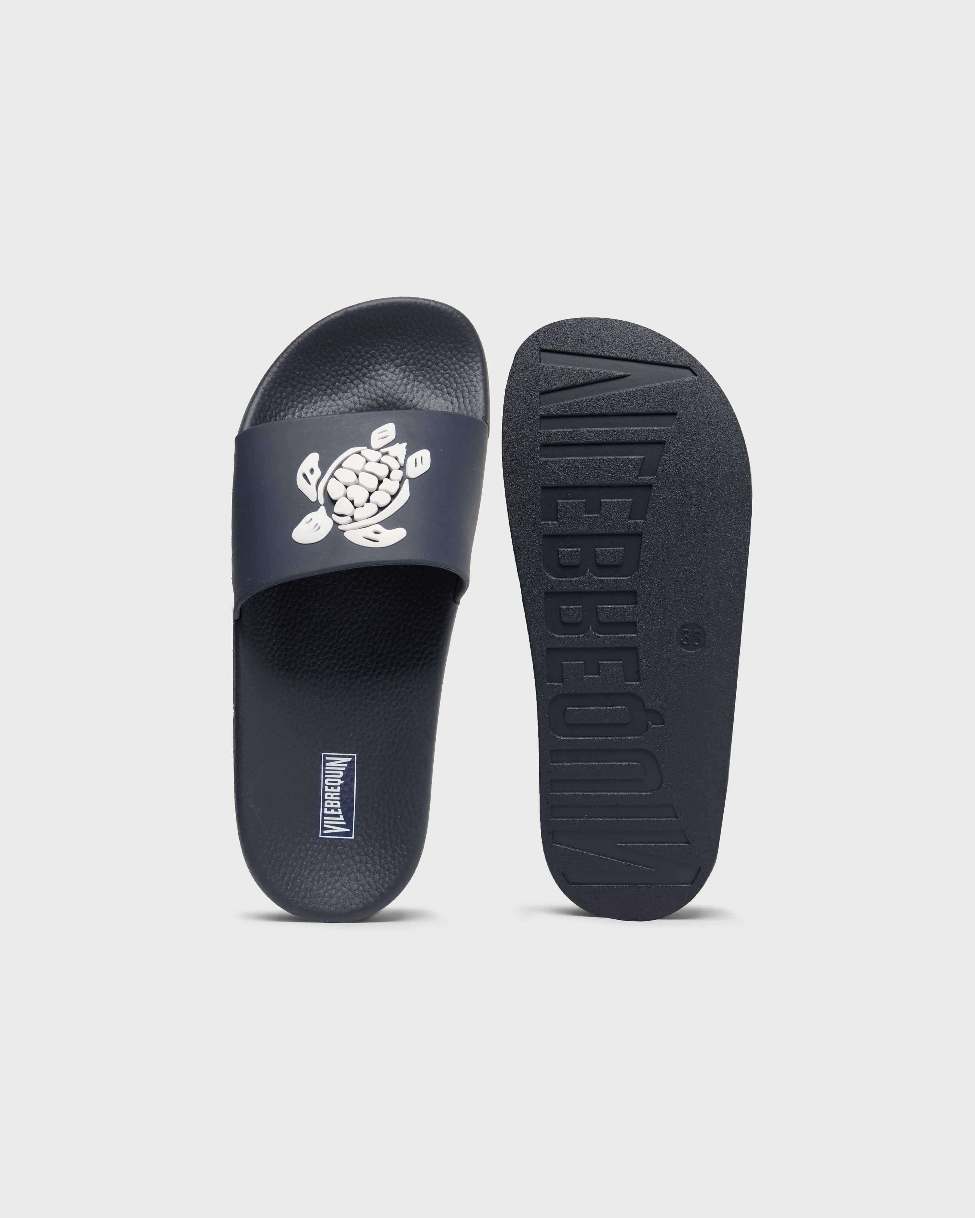 A pair of practical sliders suitable for beach and outdoor wear. Embellished with the iconic turtle and featuring the Vilebrequin logo on the sole. - Raised white Vilebrequin turtle on the top - Vilebrequin logo on the heel - 100% polyurethane Product Information Style: Cadence Model: CDCC5700-390 Color: NAVY / BLUE