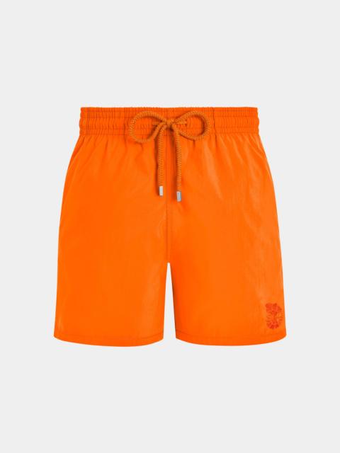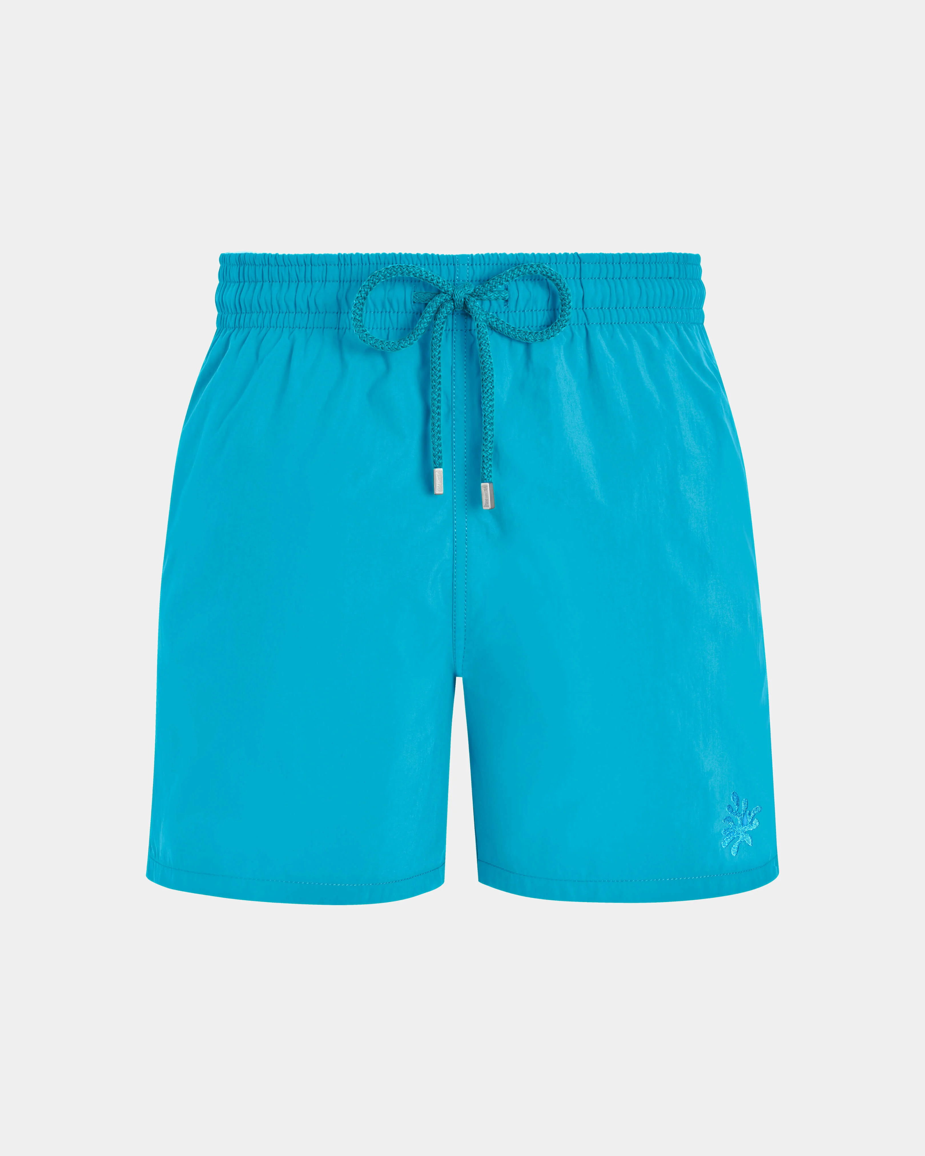 Make a splash in this pair of lined recycled polyamide men swim trunks with an elastic waistband and drawstring for the ultimate tailored fit. Once wet, the plain surface of these water-reactive men's swim trunks will reveal an array of turtles in tone-on-tone - Elastic waistband swim trunks with drawstring and zamac tips engraved Vilebrequin - Side pockets - Hand-placement of back pocket for perfect visual alignment with swimwear print - Two back eyelets allow water to drain and avoid swim trunks from ballooning when emerging into water - Fully lined with water-resistant mesh lining (100% Polyamide) - Side leg length in size M: 15.6" - Men Swim Trunks - Men Swim Trunks water-reactive Splash - 100% Recycled Polyamide Product Information Style: Moorea Model: MOOAD125-600 Color: SANTORINI / BLUE