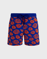 Featuring a vibrant bicolour Fishy Vibes print with a soft, velvety flocked finish, these swim trunks are styled with an elasticated waistband and a drawstring tipped with Vilebrequin-engraved zamac. - Elastic waistband men swim trunks with drawstring and zamac tips engraved Vilebrequin - Side pockets - Hand-placement of back pocket for perfect visual alignment with swimwear print - Two back eyelets allow water to drain and avoid swim trunks from ballooning when emerging into water - Fully lined with water-resistant mesh lining (100% polyamide) - Side leg length in size M: 15.6" - Inseam length in size M: 5,9" - The model is 6'0.83" and wears a M size - Men Swim shorts - Men Swim shorts Fishy vibe - 100% recycled polyamide Product Information Style: Moorea Model: MOOCD214-613 Color: MARRAKECH / BLUE