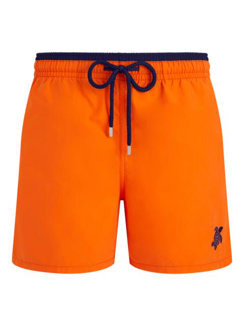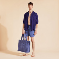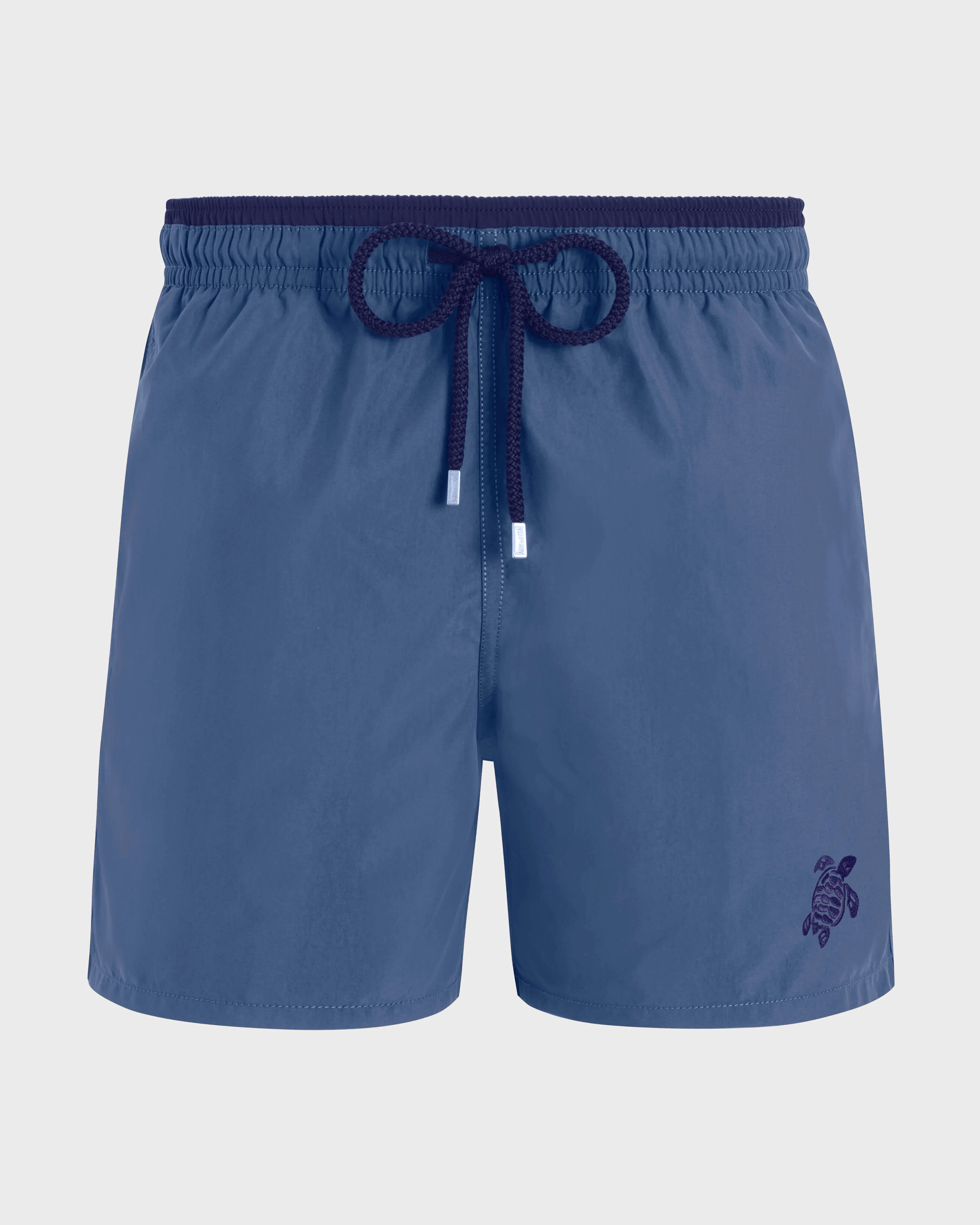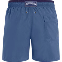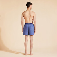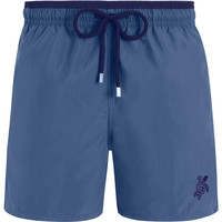 Elegance goes minimalist with these plain two-tone Moka swimming trunks. Look for the most serene of sea creatures undulating peacefully as part of a timeless contrast. Elegance goes minimalist with these plain two-tone Moka swimming trunks. Look for the most serene of sea creatures undulating peacefully as part of a timeless contrast. - Bicolor swim trunks for men with contrasting color inside waistband and .5" of outer waistband - Elastic waistband with drawstring and Zamac tips engraved with Vilebrequin - Two side pockets and one rear pocket with velcro flap - Men's swim trunks with two back eyelets allow water to drain and reduce the “balloon” effect when emerging from the water - Embroidered Turtle on bottom of left leg - Side leg length in size M: 15.6" - Men Swim Trunks - Men Swim Trunks Solid Bicolore - Model wears size M - Model measurements: Bust 37.4”, Height 72.4”, Waist 29.5”, Hips 37” - 100% Recycled Polyamide Product Information Style: Moka Model: MOKU3A01-604 Color: STORM / BLUE
