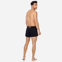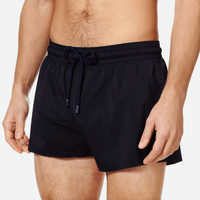 Swim even further with the Man plain men's swim shorts. Designed for maximum freedom of movement, these short and stretchy shorts have elasticated waistband and a cord with engraved tips. It is made from recycled plastics recovered from the oceans. - Short length swim trunks for men with elastic waistband. Navy drawstring and navy Zamak tips engraved with Vilebrequin - Two side slits - Swim trunks for men without side and back pockets - Two back eyelets - Side leg length in size M: 12.2" - Inseam for size M: 2.25" - Men Swim Trunks - Men Swim Trunks Solid - 98% Recycled Polyester - 2% Elastane Product Information Style: Man Model: MANH9E00-990 Color: BLACK / BLACK