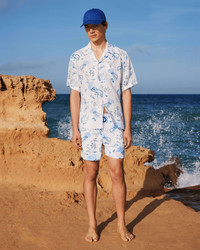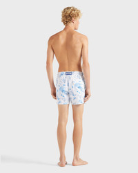 Dive into summer in these elastic-waist swim shorts adorned with a distinctive ocean-themed print. The drawstring features iconic Vilebrequin-engraved tips, while a shorter cut allows for optimum tanning. - Shorter length swim trunks with stretch fabric - Elastic waistband with drawstring and zamac tips engraved Vilebrequin - Two side pockets and one rear couture pocket with velcro flap - Two back eyelets allow water to drain and reduce the "balloon” effect when emerging from the water - Side leg length in M: 36.8 cm - slightly shorter than a Moorea classic style - Men Swim shorts - Men Swim shorts Medusa and Shells - 98% recycled polyamide 2% elastane Product Information Style: Moorise Model: MSOCF126-010 Color: WHITE / WHITE