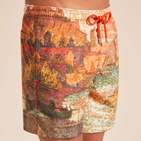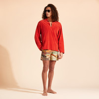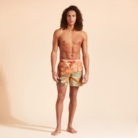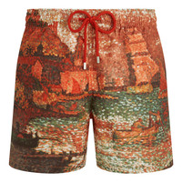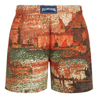 Inspired by the Impressionists' artistic use of bright colour, these stylish swim trunks feature an elastic waistband with drawstring for a comfortable fit and a rear and side pockets. A piece of wearable art, featuring Paul Signac's Sortie du port de St Tropez - Precision placement of 360 degree print - Elastic waistband with drawstring and zamac tips engraved Vilebrequin - Two side pockets and one rear couture pocket with velcro flap - Two back eyelets allow water to drain and reduce the “balloon” effect when emerging from the water - Side leg length in size M: 15.6" - Men Swim Trunks - Men Swim Trunks Sortie Du Port De St Tropez - 100% Recycled Polyamide Product Information Style: Moopea Model: MPAAB967-226 Color: BRICK / RED