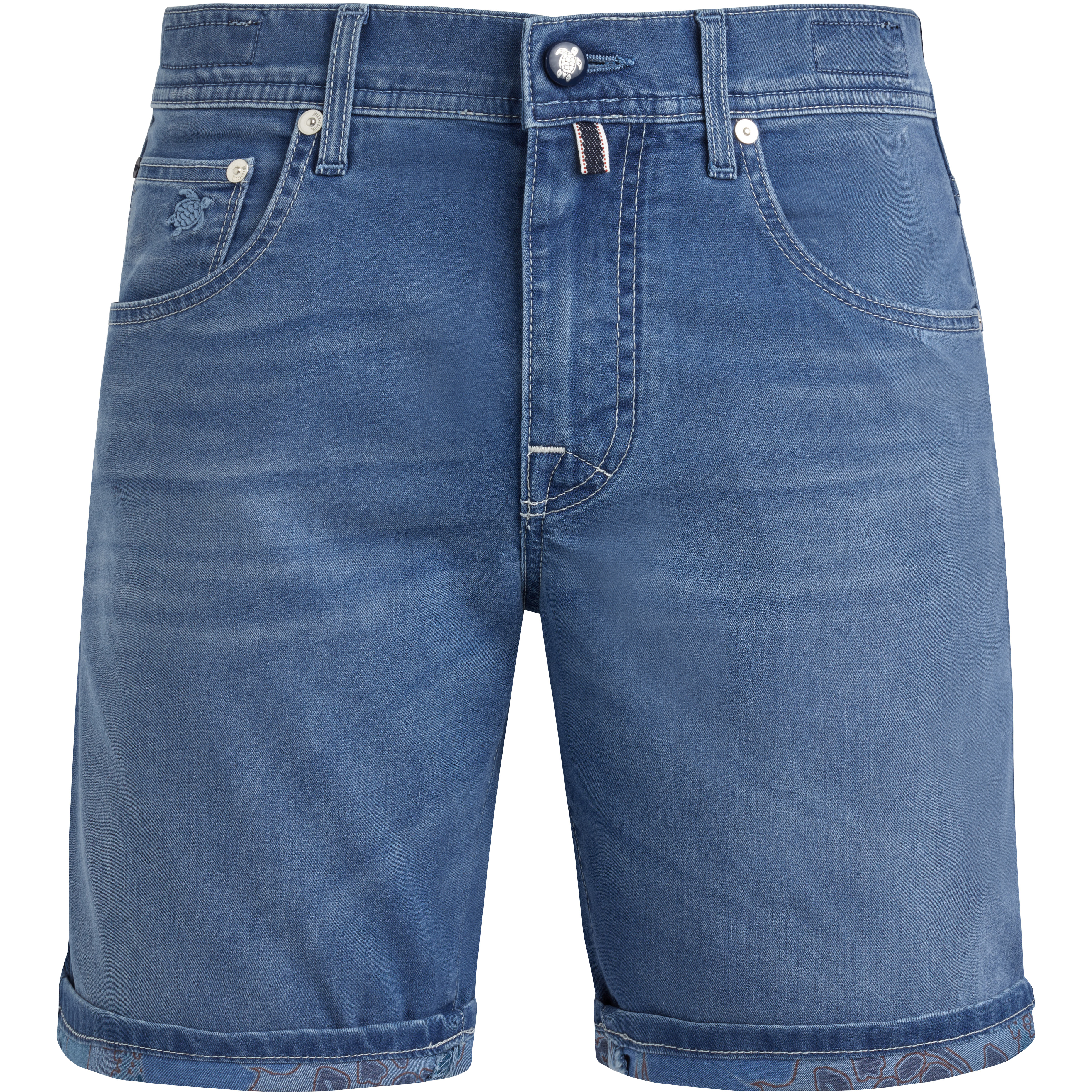 Look chic on the beach or out to lunch in these stylish Bermuda shorts crafted from cotton, polyester and elastane with a unique printed interior. - Embroidered turtle on the gusset pocket - The embroidery on the back pockets is unique to Vilebrequin and reminds the shape of the curved logo - Personalized embroidery inside the belt: Garonne, the model name - Rear jacqueron with stamped Vilebrequin's logo - Zipper fly - Loops to hold a belt - Sophisticated interior finishing, printed inside pockets all over - Small interior pocket for storing composition labels for more comfort - Made in Italy - Men Bermuda Shorts - Men Bermuda Shorts Tropical Turtles - 72% Cotton - 25% Polyester - 3% Elastane