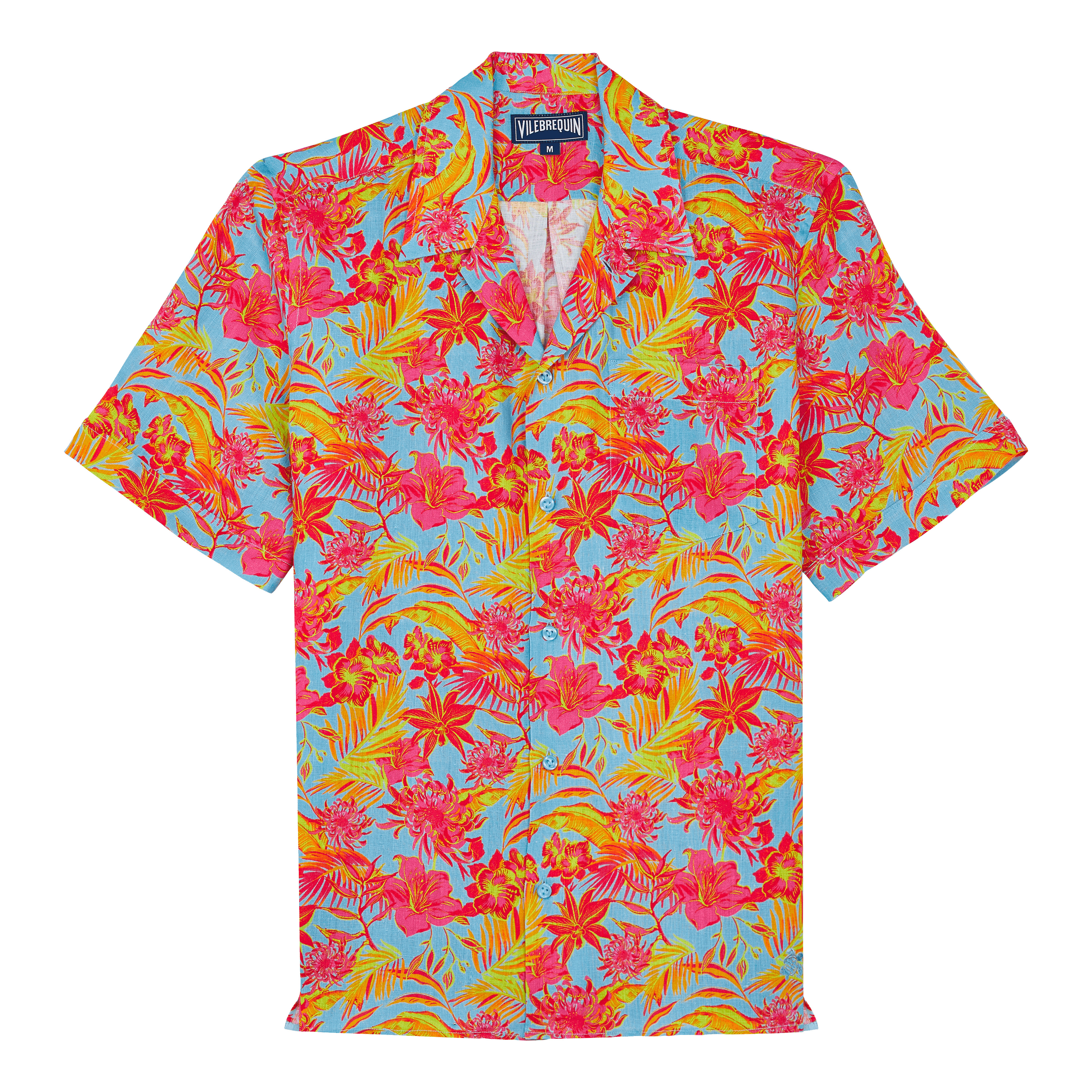 This linen bowling shirt is perfect on and off holidays. Short sleeves with a turned-back cuff add detail while the iconic embroidered turtle sits on the hip. - Bowling shirt - Short sleeves with turned back cuffs - Chest pocket - Two slits on each side - Embroidered turtle tone on tone on the bottom left - Button fastening - Middle back Length for a size M: 29.13" - Men Shirt - Men Shirt Tahiti Flowers - 100% Linen