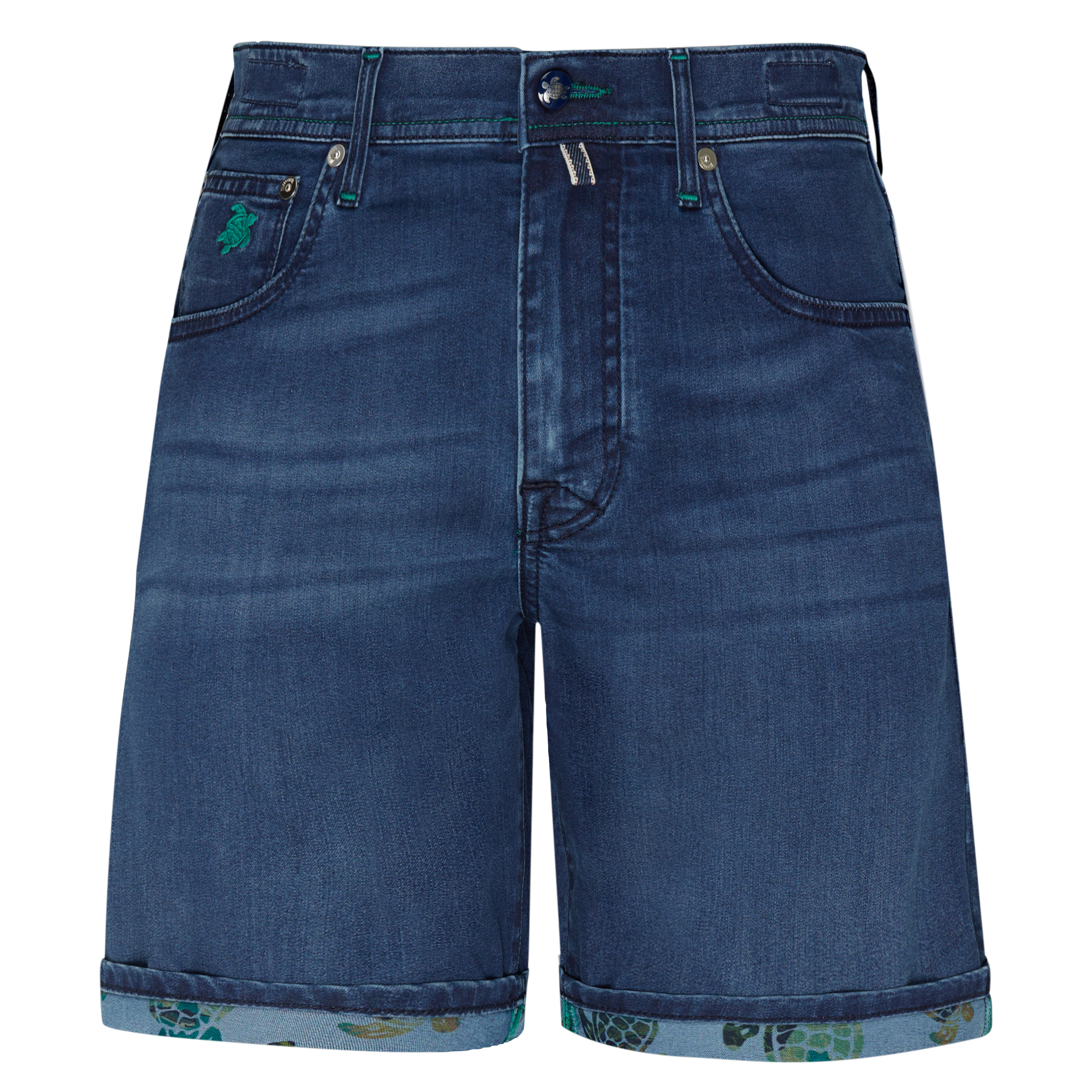 Fashioned from cotton and polyester, these men's denim Bermuda shorts offer a chic holiday look. Decorated in Tahiti turtles to celebrate the tropical theme, an essential for the holiday packing list. - Men Stretch Denim Bermuda Shorts - Embroidered turtle on the gusset pocket - The embroidery on the back pockets is unique to Vilebrequin and reminds the shape of the curved logo - Personalized embroidery inside the belt: Garonne, the model name - Rear jacqueron with stamped Vilebrequin's logo - Zipper fly - Loops to hold a belt - Sophisticated interior finishing, printed inside pockets all over - Small interior pocket for storing composition labels for more comfort - Made in Italy - The model is 72" tall and wears a size M - Men Bermuda Shorts Tahiti Turtles - Men Denim Bermuda Shorts - 72% cotton 25% polyester 3% elastane Product Information Style: Garonne Model: GRNB9014-361 Color: MED DENIM W2 / BLUE
