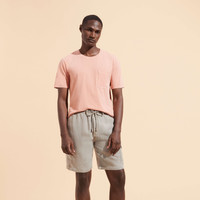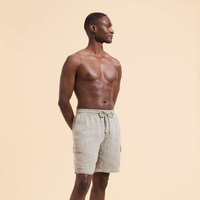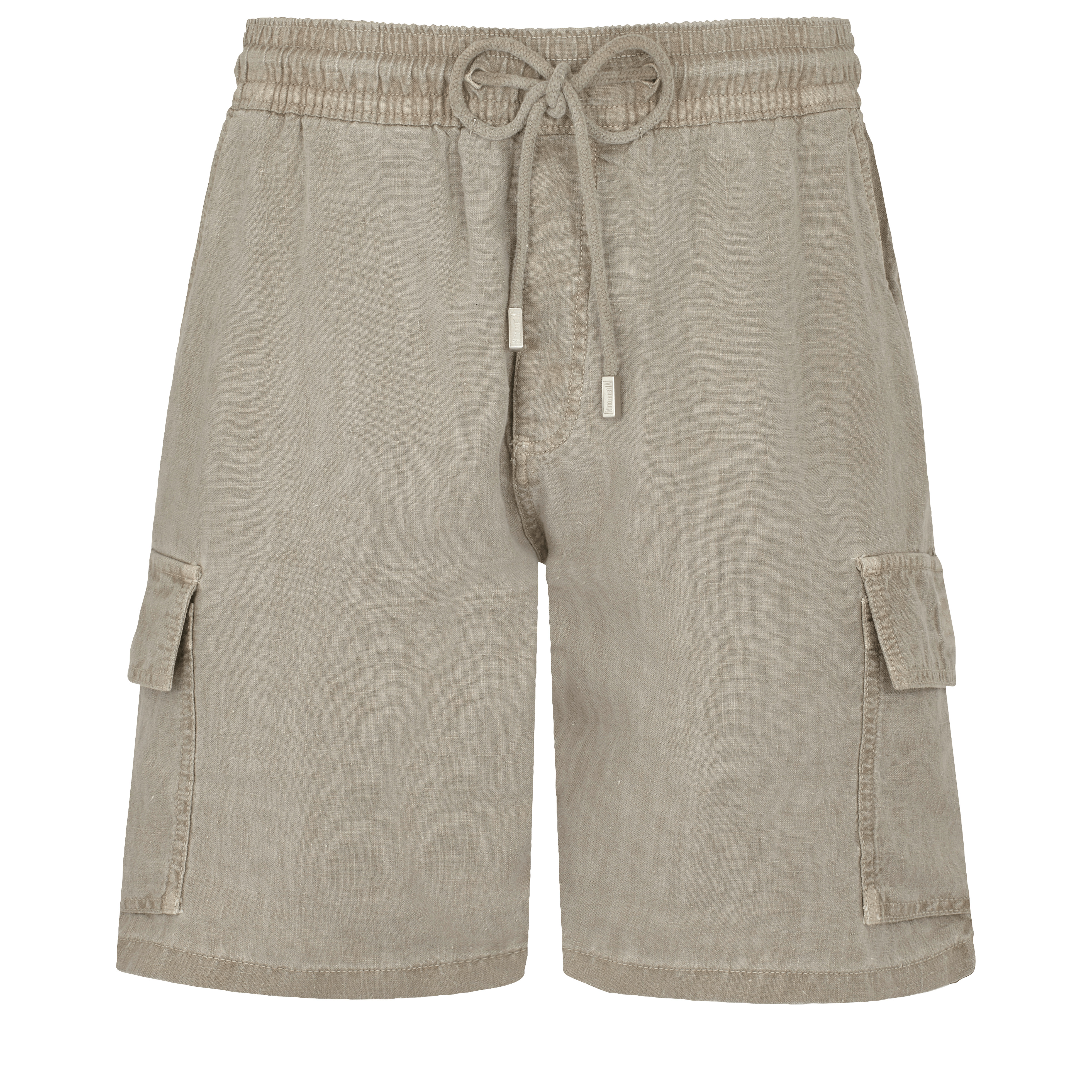 - Casual men bermuda short - Two italian pockets and two cargo pockets on sides - One back pocket with a flap - Elastic waistband with tone on tone drawstring and metal tips - Mineral dye treatment - Bottom leg width in size M: 29.00cm - Side length in size M: 49.00cm - Men Bermuda Shorts - Solid men Bermuda Shorts - 100% Linen